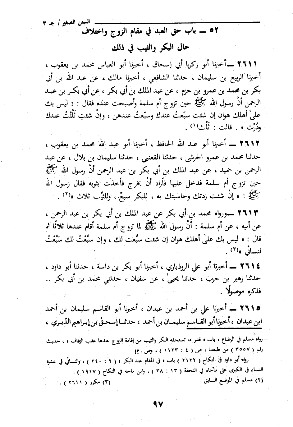 2612 - أَخْبَرَنَا أَبُو عَبْدِ اللَّهِ الْحَافِظُ، ثنا أَبُو عَبْدِ اللَّهِ مُحَمَّدُ بْنُ يَعْقُوبَ، ثنا مُحَمَّدُ بْنُ عَمْرٍو الْحَرَشِيُّ، ثنا الْقَعْنَبِيُّ، ثنا سُلَيْمَانُ بْنُ بِلَالٍ، عَنْ عَبْدِ الرَّحْمَنِ بْنِ حُمَيْدٍ، عَنْ عَبْدِ الْمَلِكِ بْنِ أَبِي بَكْرِ بْنِ عَبْدِ الرَّحْمَنِ عَنْ أَبِي بَكْرِ بْنِ عَبْدِ الرَّحْمَنِ،: أَنَّ رَسُولَ اللَّهِ صَلَّى اللهُ عَلَيْهِ وَسَلَّمَ حِينَ تَزَوَّجَ أُمَّ سَلَمَةَ فَدَخَلَ عَلَيْهَا فَأَرَادَ أَنْ يَخْرُجَ فَأَخَذَتْ بِثَوْبِهِ فَقَالَ رَسُولُ اللَّهِ صَلَّى اللهُ عَلَيْهِ وَسَلَّمَ: «§إِنْ شِئْتِ زِدْتُكِ وَحَاسَبْتُكِ بِهِ لِلْبِكْرِ سَبْعٌ، وَلِلثَّيِّبِ ثَلَاثٌ»