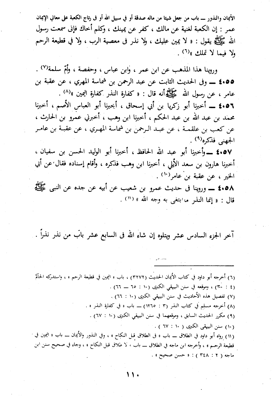 3192 - وَفِي الْحَدِيثِ الثَّابِتِ عَنْ عَبْدِ الرَّحْمَنِ بْنِ شَمَاسَةَ الْمُهْرِيِّ عَنْ عُقْبَةَ بْنِ عَامِرٍ، عَنْ رَسُولِ اللَّهِ صَلَّى اللهُ عَلَيْهِ وَسَلَّمَ أَنَّهُ قَالَ: § «كَفَّارَةُ النَّذْرِ كَفَّارَةُ الْيَمِينِ» أَخْبَرَنَا أَبُو زَكَرِيَّا بْنُ أَبِي إِسْحَاقَ، أنا أَبُو الْعَبَّاسِ الْأَصَمُّ أنا مُحَمَّدُ بْنُ عَبْدِ اللَّهِ بْنِ عَبْدِ الْحَكَمِ، أنا ابْنُ وَهْبٍ، أَخْبَرَنِي عَمْرُو بْنُ الْحَارِثِ، عَنْ كَعْبِ بْنِ عَلْقَمَةَ، عَنْ عَبْدِ الرَّحْمَنِ بْنِ شِمَاسَةَ الْمَهْرِيِّ، عَنْ عُقْبَةَ بْنِ عَامِرٍ الْجُهَنِيِّ، فَذَكَرَهُ. وَأَخْبَرَنَا أَبُو عَبْدِ اللَّهِ الْحَافِظُ، أنا أَبُو الْوَلِيدِ الْحَسَنُ بْنُ سُفْيَانَ، أنا هَارُونُ بْنُ سَعِيدٍ الْأَيْلِيُّ، أنا ابْنُ وَهْبٍ فَذَكَرَهُ، وَأَقَامَ إِسْنَادَهُ فَقَالَ: عَنْ أَبِي الْخَيْرِ، عَنْ عُقْبَةَ بْنِ عَامِرٍ