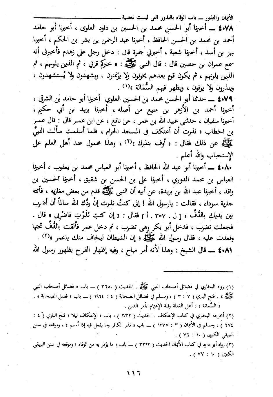 3208 - حَدَّثَنَا أَبُو الْحَسَنِ مُحَمَّدُ بْنُ الْحُسَيْنِ الْعَلَوِيُّ، أنا أَبُو حَامِدِ بْنُ الشَّرْقِيِّ، أنا أَحْمَدُ بْنُ الْأَزْهَرِ بْنِ مَنِيعٍ، مِنْ أَصْلِهِ، أنا يَزِيدُ بْنُ أَبِي حَكِيمٍ، أنا سُفْيَانُ، حَدَّثَنِي عُبَيْدُ اللَّهِ بْنُ عُمَرَ، عَنْ نَافِعٍ، عَنِ ابْنِ عُمَرَ، قَالَ: قَالَ عُمَرُ بْنُ الْخَطَّابِ: " §نَذَرْتُ أَنْ أَعْتَكِفَ، فِي الْمَسْجِدِ الْحَرَامِ، فَلَمَّا أَسْلَمْتُ سَأَلْتُ النَّبِيَّ صَلَّى اللهُ عَلَيْهِ وَسَلَّمَ عَنْ ذَلِكَ فَقَالَ: «أَوْفِ بِنَذْرِكَ» وَهَذَا مَحْمُولٌ عِنْدَ أَهْلِ الْعِلْمِ عَلَى الِاسْتِحْبَابِ، وَاللَّهُ أَعْلَمُ