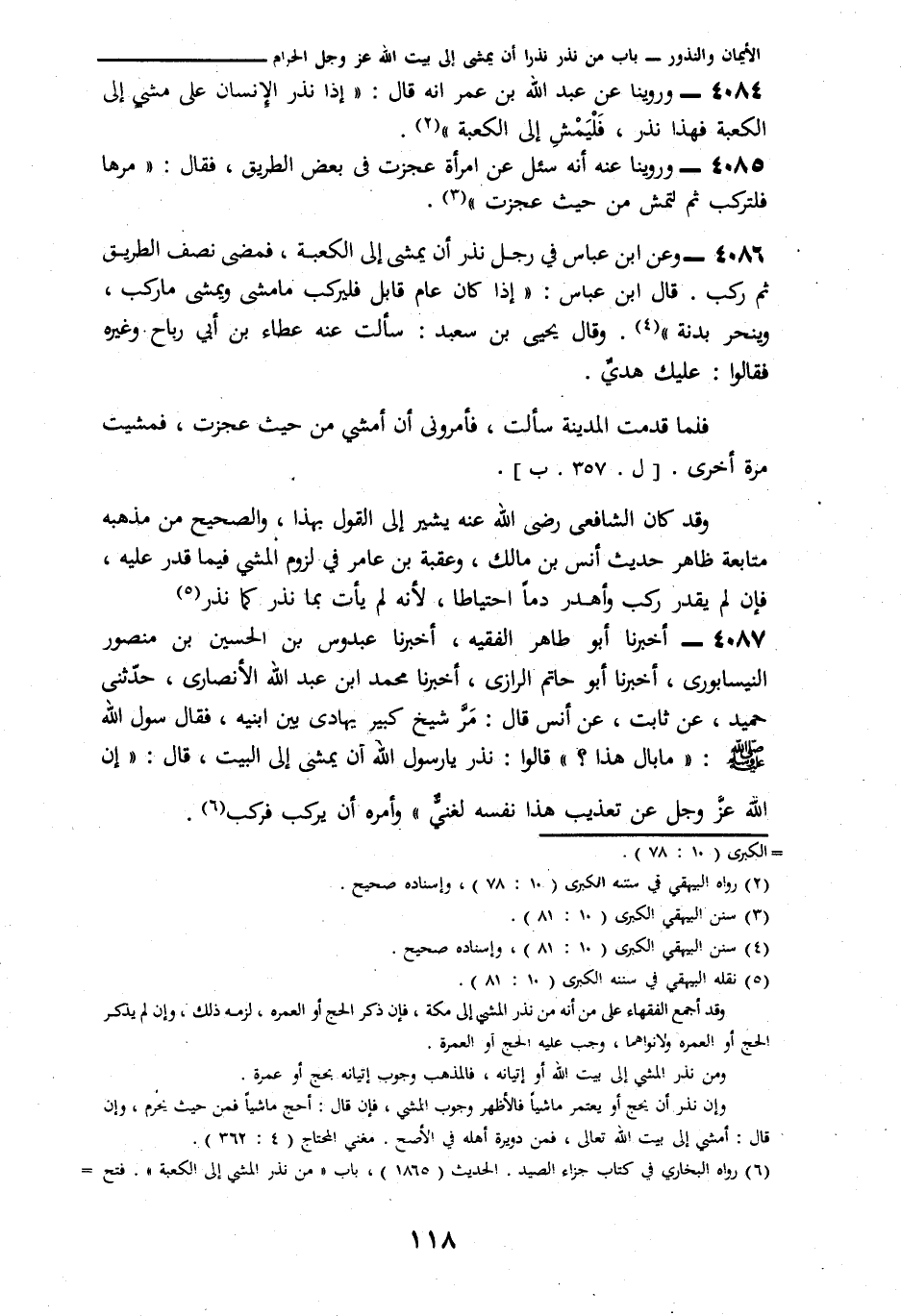 3214 - وَعَنِ ابْنِ عَبَّاسٍ، فِي رَجُلٍ نَذَرَ أَنْ يَمْشِيَ إِلَى الْكَعْبَةِ، فَمَضَى نِصْفَ الطَّرِيقِ، ثُمَّ رَكِبَ قَالَ ابْنُ عَبَّاسٍ: «§إِذَا كَانَ عَامُ قَابِلٍ فَلْيَرْكَبْ مَا مَشَى، وَيَمْشِي مَا رَكِبَ، وَيَنْحَرْ بَدَنَةً» وَقَالَ يَحْيَى بْنُ سَعِيدٍ: سَأَلْتُ عَنْهُ عَطَاءَ بْنَ أَبِي رَبَاحٍ وَغَيْرَهُ فَقَالُوا: عَلَيْكَ هَدْي فَلَمَّا قَدِمْتُ الْمَدِينَةَ سَأَلْتُ، فَأَمَرُونِي أَنْ أَمْشِيَ مِنْ حَيْثِ عَجَزْتُ، فَمَشَيْتُ مَرَّةً أُخْرَى وَقَدْ كَانَ الشَّافِعِيُّ رَضِيَ اللَّهُ عَنْهُ يُشِيرُ إِلَى الْقَوْلِ بِهَذَا، وَالصَّحِيحُ مِنْ مَذْهَبِهِ مُتَابَعَةُ ظَاهِرِ حَدِيثِ أَنَسِ بْنِ مَالِكٍ، وَعُقْبَةَ بْنِ عَامِرٍ فِي لُزُومِ الْمَشْي فِيمَا قَدَرَ عَلَيْهِ، فَإِنْ لَمْ يَقْدِرْ رَكِبَ وَأَهْدَرَ دَمًا احْتِيَاطًا، لِأَنَّهُ لَمْ يَأْتِ بِمَا نَذَرَ كَمَا نَذَرَ