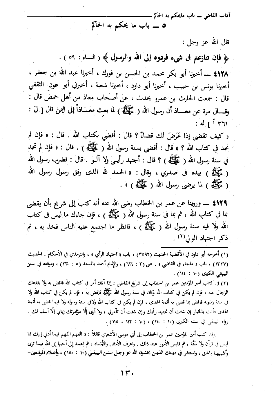 3250 - أَخْبَرَنَا أَبُو بَكْرٍ مُحَمَّدُ بْنُ الْحَسَنِ بْنِ فُورَكٍ، أنا عَبْدُ اللَّهِ بْنُ جَعْفَرٍ، أنا يُونُسُ بْنُ حَبِيبٍ، أنا أَبُو دَاوُدَ، أنا شُعْبَةُ، أَخْبَرَنِي أَبُو عَوْنٍ الثَّقَفِيُّ، قَالَ: سَمِعْتُ الْحَارِثَ بْنَ عَمْرٍو، يُحَدِّثُ، عَنْ أَصْحَابِ مُعَاذٍ مِنْ أَهْلِ حِمْصٍ قَالَ: وَقَالَ مَرَّةً عَنْ مُعَاذٍ أَنَّ رَسُولَ اللَّهِ صَلَّى اللهُ عَلَيْهِ وَسَلَّمَ لَمَّا بَعَثَ مُعَاذًا إِلَى الْيَمَنِ قَالَ لَهُ: «§كَيْفَ تَقْضِي إِذَا عَرَضَ لَكَ قَضَاءٌ؟» قَالَ: أَقْضِي بِكِتَابِ اللَّهِ قَالَ: «فَإِنْ لَمْ تَجِدْ فِي كِتَابِ اللَّهِ؟» قَالَ: أَقْضِي بِسُنَّةِ رَسُولِ اللَّهِ صَلَّى اللهُ عَلَيْهِ وَسَلَّمَ قَالَ: «فَإِنْ لَمْ تَجِدْ فِي سُنَّةِ رَسُولِ اللَّهِ صَلَّى اللهُ عَلَيْهِ وَسَلَّمَ؟» قَالَ: أَجْتَهِدُ بِرَأْيِي وَلَا آلُو قَالَ: فَضَرَبَ رَسُولُ اللَّهِ صَلَّى اللهُ عَلَيْهِ وَسَلَّمَ بِيَدِهِ فِي صَدْرِي وقَالَ: «الْحَمْدُ لِلَّهِ الَّذِي وَفَّقَ رَسُولَ رَسُولِ اللَّهِ صَلَّى اللهُ عَلَيْهِ وَسَلَّمَ لِمَا يُرْضِي رَسُولَ اللَّهِ صَلَّى اللهُ عَلَيْهِ وَسَلَّمَ»
