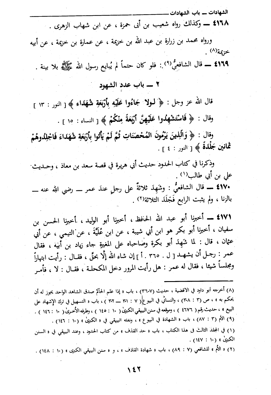 قَالَ اللَّهُ عَزَّ وَجَلَّ: {لَوْلَا جَاءُوا عَلَيْهِ بِأَرْبَعَةِ شُهَدَاءَ} وَقَالَ {فَاسْتَشْهِدُوا عَلَيْهِنَّ أَرْبَعَةً مِنْكُمْ} [النساء: 15] وَقَالَ: {وَالَّذِينَ يَرْمُونَ الْمُحْصَنَاتِ، ثُمَّ لَمْ يَأْتُوا بِأَرْبَعَةِ شُهَدَاءَ فَاجْلِدُوهُمْ ثَمَانِينَ جَلْدَةً} [النور: 4] وَذَكَرِنَا فِي كِتَابِ الْحُدُودِ حَدِيثَ أَبِي هُرَيْرَةَ فِي قِصَّةِ سَعْدِ بْنِ مُعَاذٍ، وَحَدِيثَ عَلِيِّ بْنِ أَبِي طَالِبٍ