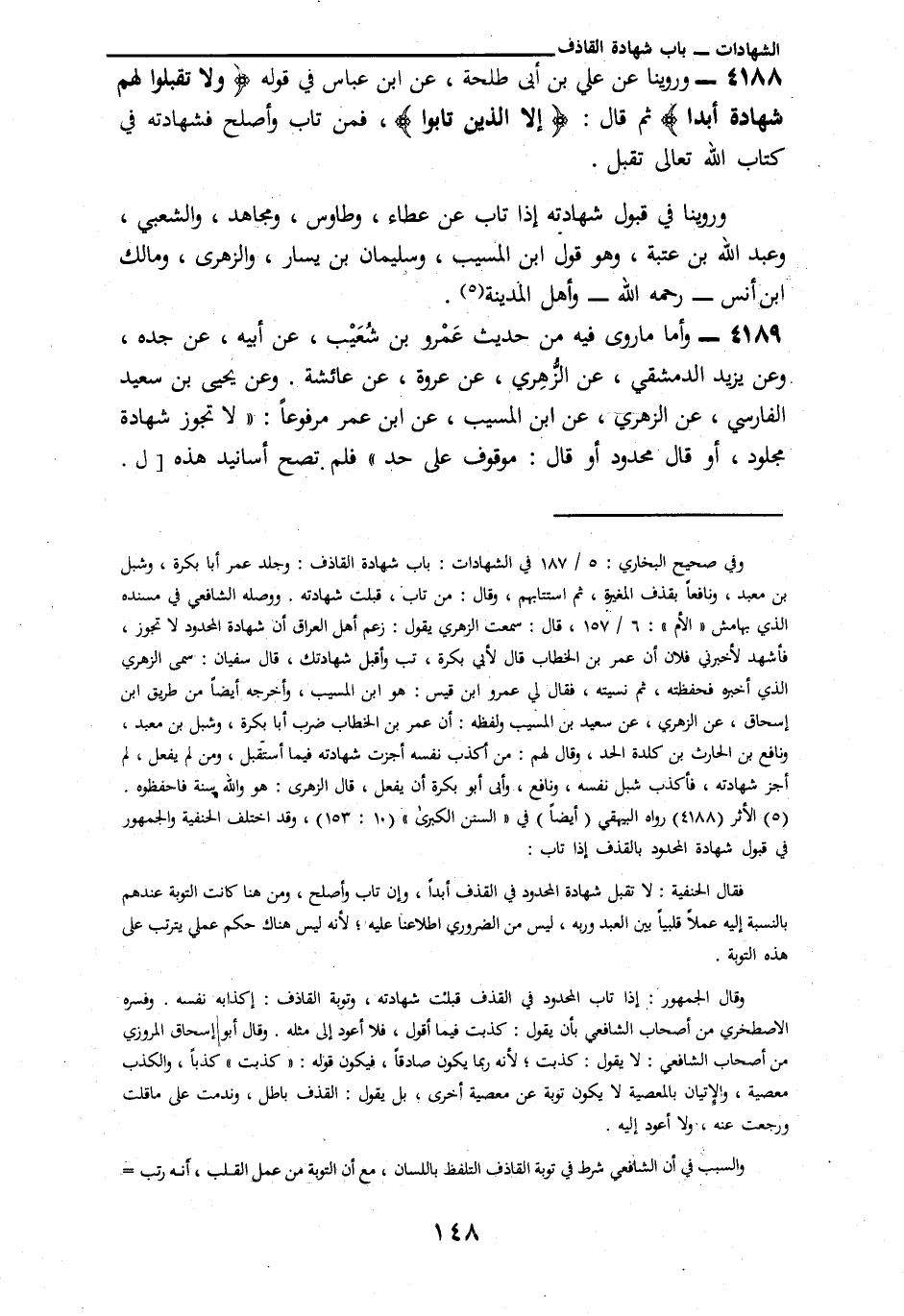 3298 - وَرُوِّينَا عَنْ عَلِيِّ بْنِ أَبِي طَلْحَةَ، عَنِ ابْنِ عَبَّاسٍ، فِي قَوْلِهِ {§وَلَا تَقْبَلُوا لَهُمْ شَهَادَةً أَبَدًا} [النور: 4] ثُمَّ قَالَ: {إِلَّا الَّذِينَ تَابُوا} [البقرة: 160] «فَمَنْ تَابَ، وَأَصْلَحَ، فَشَهَادَتُهُ فِي كِتَابِ اللَّهِ تَعَالَى تُقْبَلُ» وَرُوِّينَا فِي قَبُولِ شَهَادَتِهِ إِذَا تَابَ عَنْ عَطَاءٍ، وَطَاوُسٍ، وَمُجَاهِدٍ، وَالشَّعْبِيِّ، وَعَبْدِ اللَّهِ بْنِ عُتْبَةَ، وَهُوَ قَوْلُ ابْنِ الْمُسَيِّبِ، وَسُلَيْمَانَ بْنِ يَسَارٍ، وَالزُّهْرِيِّ، وَمَالِكِ بْنِ أَنَسٍ رَحِمَهُ اللَّهُ وَأَهْلِ الْمَدِينَةِ وَأَمَّا مَا رُوِيَ فِيهِ مِنْ حَدِيثِ عَمْرِو بْنِ شُعَيْبٍ، عَنْ أَبِيهِ، عَنْ جَدِّهِ وَعَنْ يَزِيدَ الدِّمَشْقِيِّ، عَنِ الزُّهْرِيِّ، عَنْ عُرْوَةَ، عَنْ عَائِشَةَ