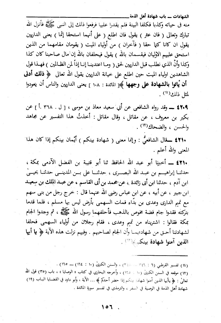 -[157]- " وَهَذَا الْحَدِيثُ الصَّحِيحُ يُشِيرُ لِتَفْسِيرِ مُقَاتِلِ بْنِ حَيَّانَ بِالصِّحَّةِ وَقَدْ يَحْتَمِلُ أَنْ يَكُونَ الْمُرَادُ بِقَوْلِهِ {شَهَادَةُ بَيْنِكُمْ إِذَا حَضَرَ أَحَدَكُمُ الْمَوْتُ حِينَ الْوَصِيَّةِ اثْنَانِ ذَوَا عَدْلٍ مِنْكُمْ} [المائدة: 106] الشَّهَادَةُ نَفْسُهَا، وَكَذَلِكَ ذَكَرَهَا مُقَاتِلُ بْنُ حَيَّانَ بِرِوَايَتِنَا وَهُوَ أَنْ يَكُونَ لِلْمُدَّعِينَ اثْنَانِ ذَوَا عَدْلٍ مِنَ الْمُسْلِمِينَ يَشْهَدَانِ لَهُمْ بِمَا ادَّعَوْا عَلَى الدَّارِيَّيْنِ مَنَ الْخِيَانَةِ، ثُمَّ قَالَ {أَوْ آخَرَانِ مِنْ غَيْرِكُمْ} [المائدة: 106]- يَعْنِي وَاللَّهُ أَعْلَمُ - إِذَا لَمْ يَكُنْ لِلْمُدَّعِينَ مِنْكُمْ بَيِّنَةٌ، فَالدَّارِيَّانِ اللَّذَانِ ادَّعِيَ عَلَيْهِمَا عَلَى مَا حَكَاهُ مُقَاتِلٌ {فَإِنْ عُثِرَ عَلَى أَنَّهُمَا اسْتَحَقَّا إِثْمًا} [المائدة: 107]- يَعْنِي ادَّعَيَا الِابْتِيَاعَ، وَالْوَارِثَانِ - لَا يَعْلَمَانِ ذَلِكَ فَيُقْسِمَانِ بِاللَّهِ عَلَى مَا ذَكَرَهُ مُقَاتِلٌ، وَاللَّهُ أَعْلَمُ