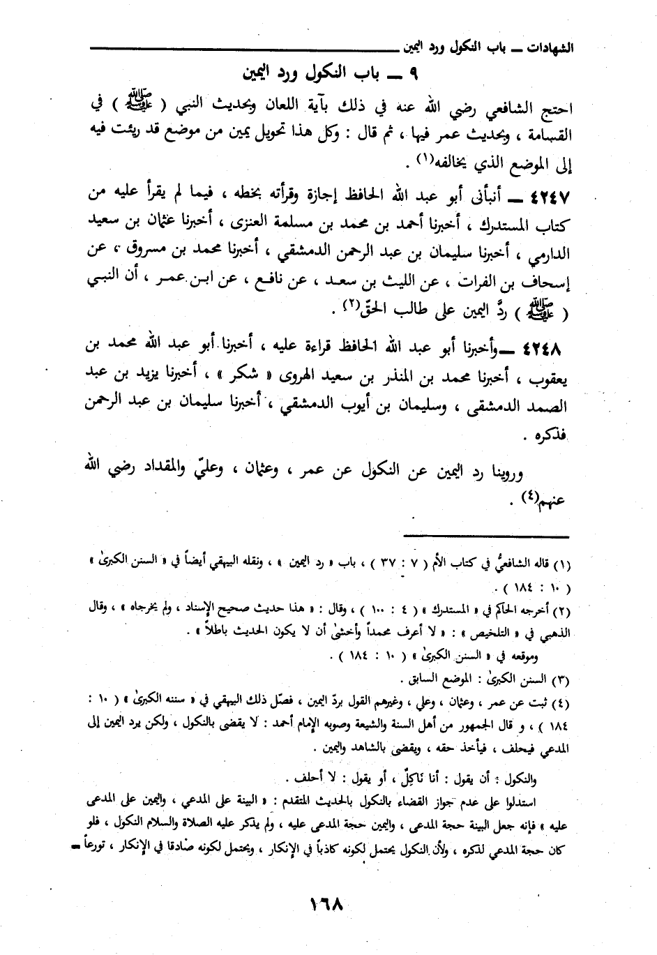 3334 - أَنْبَأَنِي أَبُو عَبْدِ اللَّهِ الْحَافِظُ، إِجَازَةً وَقَرَأْتُهُ بِخَطِّهِ، فِيمَا لَمْ يُقْرَأْ عَلَيْهِ مِنْ كِتَابِ الْمُسْتَدْرَكِ، أَخْبَرَنَا أَحْمَدُ بْنُ مُحَمَّدِ بْنِ مَسْلَمَةَ الْعَنَزِيُّ، أنا عُثْمَانُ بْنُ سَعِيدٍ الدَّارِمِيُّ، أنا سُلَيْمَانُ بْنُ عَبْدِ الرَّحْمَنِ الدِّمَشْقِيُّ، أنا مُحَمَّدُ بْنُ مَسْرُوقٍ، عَنْ إِسْحَاقَ بْنِ الْفُرَاتِ، عَنِ اللَّيْثِ بْنِ سَعْدٍ، عَنْ نَافِعٍ، عَنِ ابْنِ عُمَرَ: أَنَّ النَّبِيَّ صَلَّى اللهُ عَلَيْهِ وَسَلَّمَ § «رَدَّ الْيَمِينَ عَلَى طَالِبِ الْحَقِّ» وَأَخْبَرَنَا أَبُو عَبْدِ اللَّهِ الْحَافِظُ، قِرَاءَةً عَلَيْهِ، أنا أَبُو عَبْدِ اللَّهِ مُحَمَّدُ بْنُ يَعْقُوبَ، أنا مُحَمَّدُ بْنُ الْمُنْذِرِ بْنِ سَعِيدٍ الْهَرَوِيُّ شُكْرٌ، أنا يَزِيدُ بْنُ عَبْدِ الصَّمَدِ الْقرَشِيُّ، وسُلَيْمَانُ بْنُ أَيُّوبَ الدِّمَشْقِيُّ، أنا سُلَيْمَانُ بْنُ عَبْدِ الرَّحْمَنِ، فَذَكَرَهُ وَرُوِّينَا رَدَّ الْيَمِينِ عَنِ النُّكُولِ عَنْ عُمَرَ، وَعُثْمَانَ، وَعَلِيٍّ، وَالْمِقْدَادٍ رَضِيَ اللَّهُ عَنْهُمْ