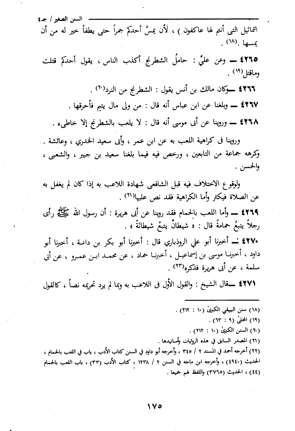 3352 - فَقَدْ رُوِّينَا عَنْ أَبِي هُرَيْرَةَ، أَنَّ رَسُولَ اللَّهِ صَلَّى اللهُ عَلَيْهِ وَسَلَّمَ رَأَى رَجُلًا يَتْبَعُ حَمَامَةً قَالَ: «§شَيْطَانٌ يَتْبَعُ شَيْطَانَةً» أَخْبَرَنَا أَبُو عَلِيٍّ الرُّوذْبَارِيُّ قَالَ: أَخْبَرَنَا أَبُو بَكْرِ بْنُ دَاسَةَ، أنا أَبُو دَاوُدَ، أَنَا مُوسَى بْنُ إِسْمَاعِيلَ، أَنَا حَمَّادٌ، عَنْ مُحَمَّدِ بْنِ عَمْرٍو، عَنْ أَبِي سَلَمَةَ، عَنْ أَبِي هُرَيْرَةَ، فَذَكَرَهُ قَالَ الشَّيْخُ: وَالْقَوْلُ الْأَوَّلُ فِي اللَّاعِبِ بِهِ وَبِمَا لَمْ يَرِدْ تَحْرِيمُهُ نَصًّا، كَالْقَوْلِ -[176]- فِي اللَّعِبِ بِالشَّطَرَنْجِ. وَأَمَّا الضَّرْبُ بِالْعُودِ وَالطَّبْلِ وَغَيْرِ ذَلِكَ مِنَ الْمَعَازِفِ
