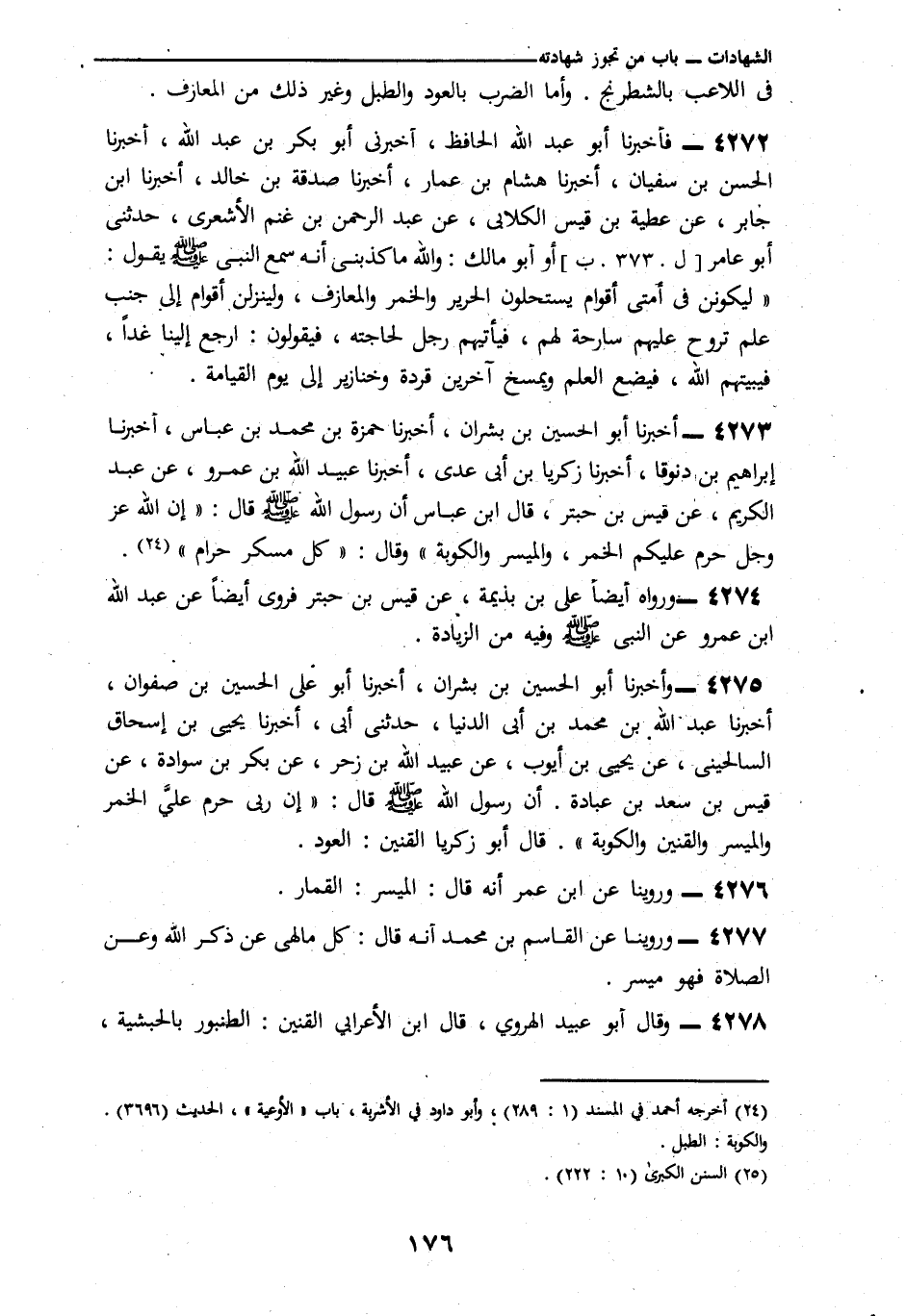 3353 - فَأَخْبَرَنَا أَبُو عَبْدِ اللَّهِ الْحَافِظُ، أَخْبَرَنِي أَبُو بَكْرِ بْنُ عَبْدِ اللَّهِ، أنا الْحَسَنُ بْنُ سُفْيَانَ، أنا هِشَامُ بْنُ عَمَّارٍ، أنا صَدَقَةُ بْنُ خَالِدٍ، أنا ابْنُ جَابِرٍ، عَنْ عَطِيَّةَ بْنِ قَيْسٍ الْكِلَابِيِّ، عَنْ عَبْدِ الرَّحْمَنِ بْنِ غَنْمٍ الْأَشْعَرِيِّ، حَدَّثَنِي أَبُو عَامِرٍ، أَوْ أَبُو مَالِكٍ: وَاللَّهِ مَا كَذَبَنِي أَنَّهُ سَمِعَ النَّبِيَّ صَلَّى اللهُ عَلَيْهِ وَسَلَّمَ يَقُولُ: " §لَيَكُونَنَّ فِي أُمَّتِي أَقْوَامٌ يَسْتَحِلُّونَ الْحَرِيرَ، وَالْخَمْرَ، وَالْمَعَازِفَ، وَلَيَنْزِلَنَّ أَقْوَامٌ إِلَى جَنْبِ عَلَمٍ تَرُوحُ عَلَيْهِمْ سَارِحَةٌ لَهُمْ، فَيَأْتِيهِمْ رَجُلٌ لِحَاجَتِهِ، فَيَقُولُونَ: ارْجِعْ إِلَيْنَا غَدًا، فَيُبَيِّتُهُمُ اللَّهُ، فَيَضَعُ الْعِلْمَ، وَيَمْسَخُ آخَرِينَ قِرَدَةً، وَخَنَازِيرَ إِلَى يَوْمِ الْقِيَامَةِ "