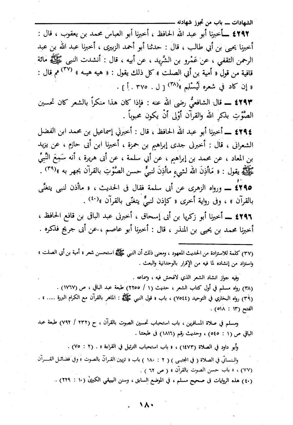 3365 - أَخْبَرَنَا أَبُو عَبْدِ اللَّهِ الْحَافِظُ، أنا أَبُو الْعَبَّاسِ مُحَمَّدُ بْنُ يَعْقُوبَ قَالَ: أنا يَحْيَى بْنُ أَبِي طَالِبٍ، قَالَ: حَدَّثَنَا أَبُو أَحْمَدَ الزُّبَيْرِيُّ، أنا عَبْدُ اللَّهِ بْنُ عَبْدِ الرَّحْمَنِ الثَّقَفِيُّ، عَنْ عَمْرِو بْنِ الشَّرِيدِ، عَنْ أَبِيهِ، قَالَ: §أَنْشَدْتُ النَّبِيَّ صَلَّى اللهُ عَلَيْهِ وَسَلَّمَ مِائَةَ قَافِيَةٍ مِنْ قَوْلِ أُمَيَّةَ بْنِ أَبِي الصَّلْتِ، كُلَّ ذَلِكَ يَقُولُ: «هِيهْ هِيهْ» ثُمَّ قَالَ: «إِنْ كَانَ فِي شِعْرِهِ لِيُسْلِمْ» قَالَ الشَّافِعِيُّ رَضِيَ اللَّهُ عَنْهُ: فَإِذَا كَانَ هَذَا هَكَذَا بِالشِّعْرِ كَانَ تَحْسِينُ الصَّوْتِ بِذِكْرِ اللَّهِ، وَالْقُرْآنِ أَوْلَى أَنْ يَكُونَ مَحْبُوبًا