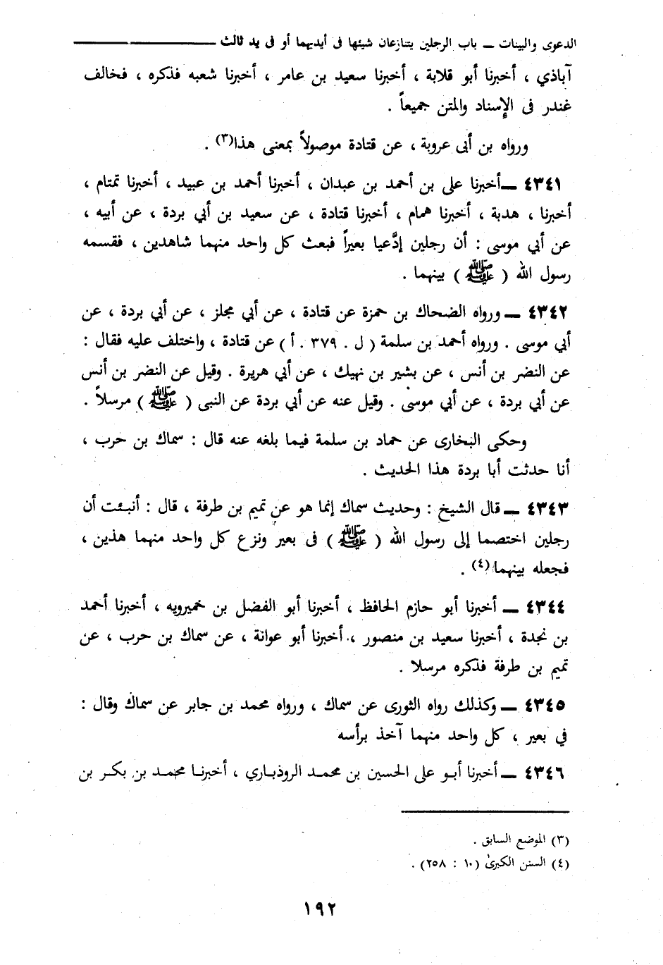 3393 - أَخْبَرَنَا عَلِيُّ بْنُ أَحْمَدَ بْنِ عَبْدَانَ، أنا أَحْمَدُ بْنُ عُبَيْدٍ، أنا تَمْتَامٌ، أنا هُدْبَةُ، أنا هَمَّامٌ، أنا قَتَادَةُ، عَنْ سَعِيدِ بْنِ أَبِي بُرْدَةَ، عَنْ أَبِيهِ، عَنْ أَبِي مُوسَى أَنَّ رَجُلَيْنِ ادَّعَيَا بَعِيرًا فَبَعَثَ كُلُّ وَاحِدٍ مِنْهُمَا شَاهِدَيْنِ، § «فَقَسَمَهُ رَسُولُ اللَّهِ صَلَّى اللهُ عَلَيْهِ وَسَلَّمَ بَيْنَهُمَا» وَرَوَاهُ الضَّحَّاكُ بْنُ حُمْرَةَ، عَنْ قَتَادَةَ، عَنْ أَبِي مِجْلَزٍ، عَنْ أَبِي بُرْدَةَ، عَنْ أَبِي مُوسَى، وَرَوَاهُ أَحْمَدُ بْنُ سَلَمَةَ عَنْ قَتَادَةَ، وَاخْتَلَفَ عَلَيْهِ فَقَالَ: عَنِ النَّضْرِ بْنِ أَنَسٍ، عَنْ بَشِيرِ بْنِ نَهِيكٍ، عَنْ أَبِي هُرَيْرَةَ، وَقِيلَ عَنِ النَّضْرِ بْنِ أَنَسٍ، عَنْ أَبِي بُرْدَةَ، عَنْ أَبِي مُوسَى، وَقِيلَ عَنْهُ عَنْ أَبِي بُرْدَةَ، عَنِ النَّبِيِّ صَلَّى اللهُ عَلَيْهِ وَسَلَّمَ مُرْسَلًا وَحَكَى الْبُخَارِيُّ عَنْ حَمَّادِ بْنِ سَلَمَةَ فِيمَا بَلَغَهُ عَنْهُ قَالَ سِمَاكُ بْنُ حَرْبٍ: أنا حَدَّثْتُ أَبَا بُرْدَةَ هَذَا الْحَدِيثَ قَالَ الشَّيْخُ: وَحَدِيثُ سِمَاكٍ إِنَّمَا هُوَ عَنْ تَمِيمِ بْنِ طَرَفَةَ قَالَ: أُنْبِئْتُ أَنَّ رَجُلَيْنِ اخْتَصَمَا إِلَى رَسُولِ اللَّهِ صَلَّى اللهُ عَلَيْهِ وَسَلَّمَ فِي بَعِيرٍ وَنَزَعَ كُلُّ وَاحِدٍ مِنْهُمَا شَاهِدَيْنِ، فَجَعَلَهُ بَيْنَهُمَا أَخْبَرَنَا أَبُو حَازِمٍ الْحَافِظُ، أنا أَبُو الْفَضْلِ بْنُ خَمِيرَوَيْهِ، أنا ابْنُ نَجْدَةَ، أنا سَعِيدُ بْنُ مَنْصُورٍ، أنا أَبُو عَوَانَةَ، عَنْ سِمَاكِ بْنِ حَرْبٍ، عَنْ تَمِيمِ بْنِ طَرَفَةَ، فَذَكَرَهُ مُرْسَلًا. وَكَذَلِكَ رَوَاهُ الثَّوْرِيُّ، عَنْ سِمَاكٍ، وَرَوَاهُ، مُحَمَّدُ بْنُ جَابِرٍ عَنْ سِمَاكٍ، وَقَالَ فِي بَعِيرٍ، كُلُّ وَاحِدٍ مِنْهُمَا آخِذٌ بِرَأْسِهِ