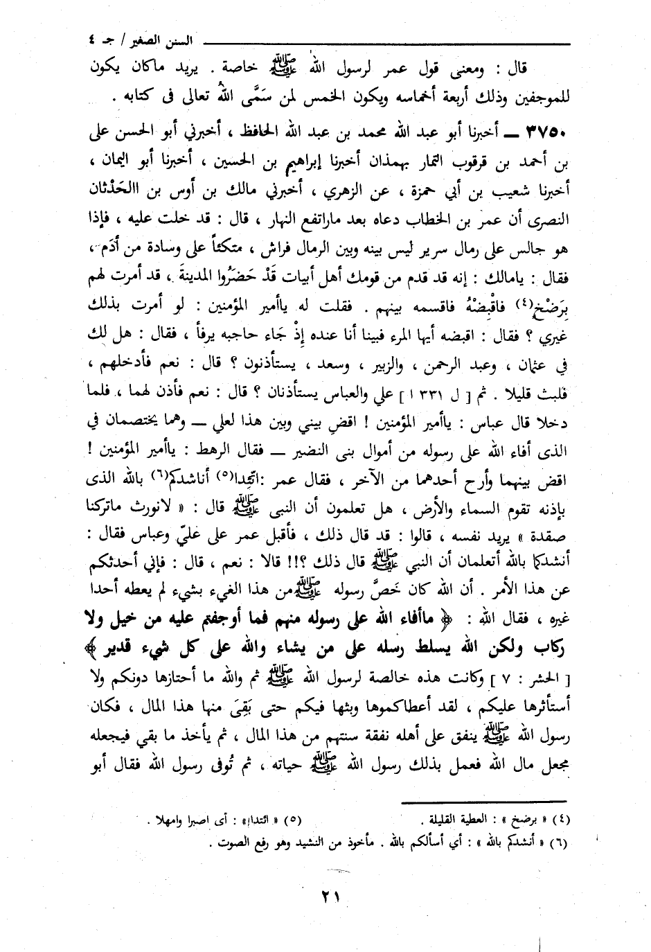 2968 - أَخْبَرَنَا أَبُو عَبْدِ اللَّهِ مُحَمَّدُ بْنُ عَبْدِ اللَّهِ الْحَافِظُ، أَخْبَرَنِي أَبُو الْحَسَنِ عَلِيُّ بْنُ أَحْمَدَ بْنِ قَرْقُوبٍ التَّمَّارُ بِهَمَذَانَ أنا إِبْرَاهِيمُ بْنُ الْحُسَيْنِ، أنا أَبُو الْيَمَانِ، أنا شُعَيْبُ بْنُ أَبِي حَمْزَةَ، عَنِ الزُّهْرِيِّ، أَخْبَرَنِي مَالِكُ بْنُ أَوْسِ بْنِ الْحَدَثَانِ النَّصْرِيُّ، أَنَّ عُمَرَ بْنَ الْخَطَّابِ، دَعَاهُ بَعْدَ مَا ارْتَفَعَ النَّهَارُ قَالَ: فَدَخَلْتُ عَلَيْهِ، فَإِذَا هُوَ جَالِسٌ عَلَى رِمَالِ سَرِيرٍ لَيْسَ بَيْنَهُ وَبَيْنَ الرِّمَالِ فِرَاشٌ، مُتَّكِئًا عَلَى وِسَادَةٍ مِنْ أَدَمٍ، فَقَالَ: يَا مَالِكُ، إِنَّهُ قَدْ قَدِمَ مِنْ قَوْمِكَ أَهْلُ أَبْيَاتٍ قَدْ حَضَرُوا الْمَدِينَةَ، قَدْ أَمَرْتُ لَهُمْ بِرَضْخٍ فَاقْبِضْهُ فَاقْسِمْهُ بَيْنَهُمْ فَقُلْتُ لَهُ: يَا أَمِيرَ الْمُؤْمِنِينَ، لَوْ أَمَرْتَ بِذَلِكَ غَيْرِي؟ فَقَالَ: اقْبِضْهُ أَيُّهَا الْمَرْءُ. فَبَيْنَا أَنَا عِنْدَهُ إِذْ جَاءَ حَاجِبُهُ يَرْفَأُ، فَقَالَ: هَلْ لَكَ فِي عُثْمَانَ، وَعَبْدِ الرَّحْمَنِ، وَالزُّبَيْرِ، وَسَعْدٍ يَسْتَأْذِنُونَ؟ قَالَ: نَعَمْ فَأَدْخَلَهُمْ، فَلَبِثَ قَلِيلًا ثُمَّ جَاءَهُ فَقَالَ هَلْ لَكَ فِي عَلِيٍّ وَالْعَبَّاسِ يَسْتَأْذِنَانِ؟ قَالَ: نَعَمْ، فَأَذِنْ لَهُمَا، فَلَمَّا دَخَلَا قَالَ عَبَّاسٌ: يَا أَمِيرَ الْمُؤْمِنِينَ، اقْضِ بَيْنِي وَبَيْنَ هَذَا لِعَلِيٍّ وَهُمَا يَخْتَصِمَانِ فِي الَّذِي أَفَاءَ اللَّهُ عَلَى رَسُولِهِ مِنْ أَمْوَالِ بَنِي النَّضِيرِ فَقَالَ الرَّهْطُ: يَا أَمِيرَ الْمُؤْمِنِينَ، اقْضِ بَيْنَهُمَا وَأَرِحْ أَحَدَهُمَا مِنَ الْآخَرِ، فَقَالَ عُمَرُ: اتَّئِدَوا أُنَاشِدُكُمْ بِاللَّهِ الَّذِي بِإِذْنِهِ تَقُومُ السَّمَاءُ وَالْأَرْضُ، هَلْ تَعْلَمُونَ أَنَّ النَّبِيَّ صَلَّى اللهُ عَلَيْهِ وَسَلَّمَ قَالَ: «§لَا نُورَثُ مَا تَرَكْنَا صَدَقَةٌ» يُرِيدُ نَفْسَهُ، قَالُوا: قَدْ قَالَ ذَلِكَ، فَأَقْبَلَ عُمَرُ عَلَى عَلِيٍّ وَعَبَّاسٍ فَقَالَ: أَنْشُدُكُمَا بِاللَّهِ أَتَعْلَمَانِ أَنَّ النَّبِيَّ صَلَّى اللهُ عَلَيْهِ وَسَلَّمَ قَالَ ذَلِكَ؟ قَالَا: نَعَمْ. قَالَ: فَإِنِّي أُحَدِّثُكُمْ عَنْ هَذَا الْأَمْرِ أَنَّ اللَّهَ كَانَ خَصَّ رَسُولَهُ صَلَّى اللهُ عَلَيْهِ وَسَلَّمَ مِنْ هَذَا الْفَيْءِ بِشَيْءٍ لَمْ يُعْطِهِ أَحَدًا غَيْرَهُ، فَقَالَ اللَّهُ {وَمَا أَفَاءَ اللَّهُ عَلَى رَسُولِهِ مِنْهُمْ فَمَا أَوْجَفْتُمْ عَلَيْهِ مِنْ خَيْلٍ وَلَا رِكَابٍ وَلَكِنَّ اللَّهَ يُسَلِّطُ رُسُلَهُ عَلَى مَنْ يَشَاءُ وَاللَّهُ عَلَى كُلِّ شَيْءٍ قَدِيرٌ} [الحشر: 6] وَكَانَتْ هَذِهِ خَالِصَةً لِرَسُولِ اللَّهِ صَلَّى اللهُ عَلَيْهِ وَسَلَّمَ، فَوَاللَّهِ مَا احْتَازَهَا دُونَكُمْ وَلَا اسْتَأْثَرَهَا عَلَيْكُمْ، لَقَدْ أَعْطَاكُمُوهَا وَبَثَّهَا فِيكُمْ حَتَّى بَقِيَ مِنْهَا هَذَا الْمَالُ، فَكَانَ رَسُولُ اللَّهِ صَلَّى اللهُ عَلَيْهِ وَسَلَّمَ يُنْفِقُ عَلَى أَهْلِهِ نَفَقَةَ سَنَتِهِمْ مِنْ هَذَا الْمَالِ، ثُمَّ يَأْخُذُ مَا بَقِيَ فَيَجْعَلُهُ مَجْعَلَ مَالِ اللَّهِ فَعَمِلَ بِذَلِكَ رَسُولُ اللَّهِ صَلَّى اللهُ عَلَيْهِ وَسَلَّمَ حَيَاتَهُ، ثُمَّ تُوُفِّيَ رَسُولُ اللَّهِ صَلَّى اللهُ عَلَيْهِ وَسَلَّمَ فَقَالَ أَبُو -[22]- بَكْرٍ: فَأَنَا وَلِيُّ رَسُولِ اللَّهِ صَلَّى اللهُ عَلَيْهِ وَسَلَّمَ فَقَبَضَهُ أَبُو بَكْرٍ فَعَمِلَ فِيهِ بِمَا عَمِلَ فِيهِ رَسُولُ اللَّهِ صَلَّى اللهُ عَلَيْهِ وَسَلَّمَ وَأَنْتُمْ حِينَئِذٍ وَأَقْبَلَ عَلَى عَلِيٍّ وَعَبَّاسٍ رَضِيَ اللَّهُ عَنْهُمَا تَذْكُرَانِ أَنَّ أَبَا بَكْرٍ فِيهِ كَمَا تَقُولَانِ، وَاللَّهُ يَعْلَمُ أَنَّهُ ف