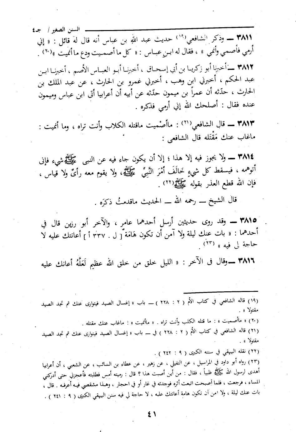وَذَكَرَ الشَّافِعِيُّ حَدِيثَ عَبْدِ اللَّهِ بْنِ عَبَّاسٍ أَنَّهُ قَالَ لَهُ قَائِلٌ: «إِنِّي أَرْمِي فَأُصْمِي وَأُنْمِي» فَقَالَ لَهُ ابْنُ عَبَّاسٍ: «كُلْ مَا أَصْمَيْتَ وَدَعْ مَا أَنْمَيْتَ» أَخْبَرَنَا أَبُو زَكَرِيَّا بْنُ أَبِي إِسْحَاقَ، أنا أَبُو الْعَبَّاسِ الْأَصَمُّ، أنا ابْنُ عَبْدِ الْحَكَمِ، أَخْبَرَنِي ابْنُ وَهْبٍ، أَخْبَرَنِي عَمْرُو بْنُ الْحَارِثِ، عَنْ عَبْدِ الْمَلِكِ بْنِ الْحَارِثِ، حَدَّثَهُ أَنَّ عَمْرَو بْنَ مَيْمُونٍ حَدَّثَهُ عَنْ أَبِيهِ، أَنَّ أَعْرَابِيًّا، أَتَى ابْنَ عَبَّاسٍ وَمَيْمُونٌ عِنْدَهُ فَقَالَ: أَصْلَحَكَ اللَّهُ إِنِّي أَرْمِي، فَذَكَرَهُ قَالَ الشَّافِعِيُّ: مَا أَصْمَيْتَ: مَا قَتَلَهُ الْكِلَابُ وَأَنْتَ تَرَاهُ، وَمَا أَنْمَيْتَ: مَا غَابَ عَنْكَ مَقْتَلُهُ. قَالَ الشَّافِعِيُّ: وَلَا يَجُوزُ فِيهِ إِلَّا هَذَا إِلَّا أَنْ يَكُونَ جَاءَ فِيهِ عَنِ النَّبِيِّ صَلَّى اللهُ عَلَيْهِ وَسَلَّمَ شَيْءٌ فَإِنِّي أَتَوَهَّمُهُ، فَيَسْقُطُ كُلُّ شَيْءٍ خَالَفَ أَمْرَ النَّبِيِّ صَلَّى اللهُ عَلَيْهِ وَسَلَّمَ، وَلَا يَقُومُ مَعَهُ رَأْي وَلَا قِيَاسٌ، فَإِنَّ اللَّهَ قَطَعَ الْعُذْرَ بِقَوْلِهِ صَلَّى اللهُ عَلَيْهِ وَسَلَّمَ قَالَ الشَّيْخُ رَحِمَهُ اللَّهُ: الْحَدِيثُ مَا قَدَّمْتُ ذِكْرَهُ. وَقَدْ رَوَى حَدِيثَيْنِ أَرْسَلَ أَحَدَهُمَا عَامِرٌ، وَالْآخَرَ أَبُو رَزِينٍ قَالَ فِي أَحَدِهِمَا: «بَاتَ عَنْكَ لَيْلَةً، وَلَا آمَنُ أَنْ تَكُونَ هَامَةٌ أَعَانَتْكَ عَلَيْهِ، لَا حَاجَةَ لِي فِيهِ». وَقَالَ فِي الْآخَرِ: «اللَّيْلُ خَلْقٌ مِنْ خَلْقِ اللَّهِ عَظِيمٌ لَعَلَّهُ أَعَانَكَ عَلَيْهِ