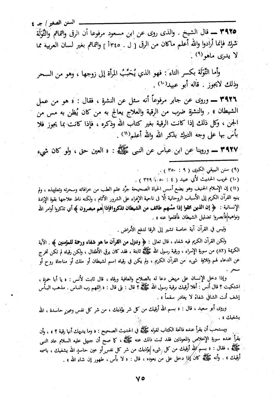 3101 - وَرُوِيَ، عَنْ جَابِرٍ، مَرْفُوعًا أَنَّهُ سُئِلَ عَنِ النُّشْرَةِ، فَقَالَ: § «هُوَ مِنْ عَمَلِ الشَّيْطَانِ» وَالنُّشْرَةُ ضَرْبٌ مِنَ الرُّقْيَةِ وَالْعِلَاجِ يُعَالَجُ بِهِ مَنْ كَانَ يُظَنُّ بِهِ مَسٌّ مِنَ الْجِنِّ، وَكُلُّ ذَلِكَ إِذَا كَانَتِ الرُّقْيَةُ بِغَيْرِ كِتَابِ اللَّهِ وَذِكْرِهِ، فَإِذَا كَانَتْ بِمَا يَجُوزُ فَلَا بَأْسَ بِهَا عَلَى وَجْهِ التَّبَرُّكِ بِذِكْرِ اللَّهِ " وَاللَّهُ أَعْلَمُ