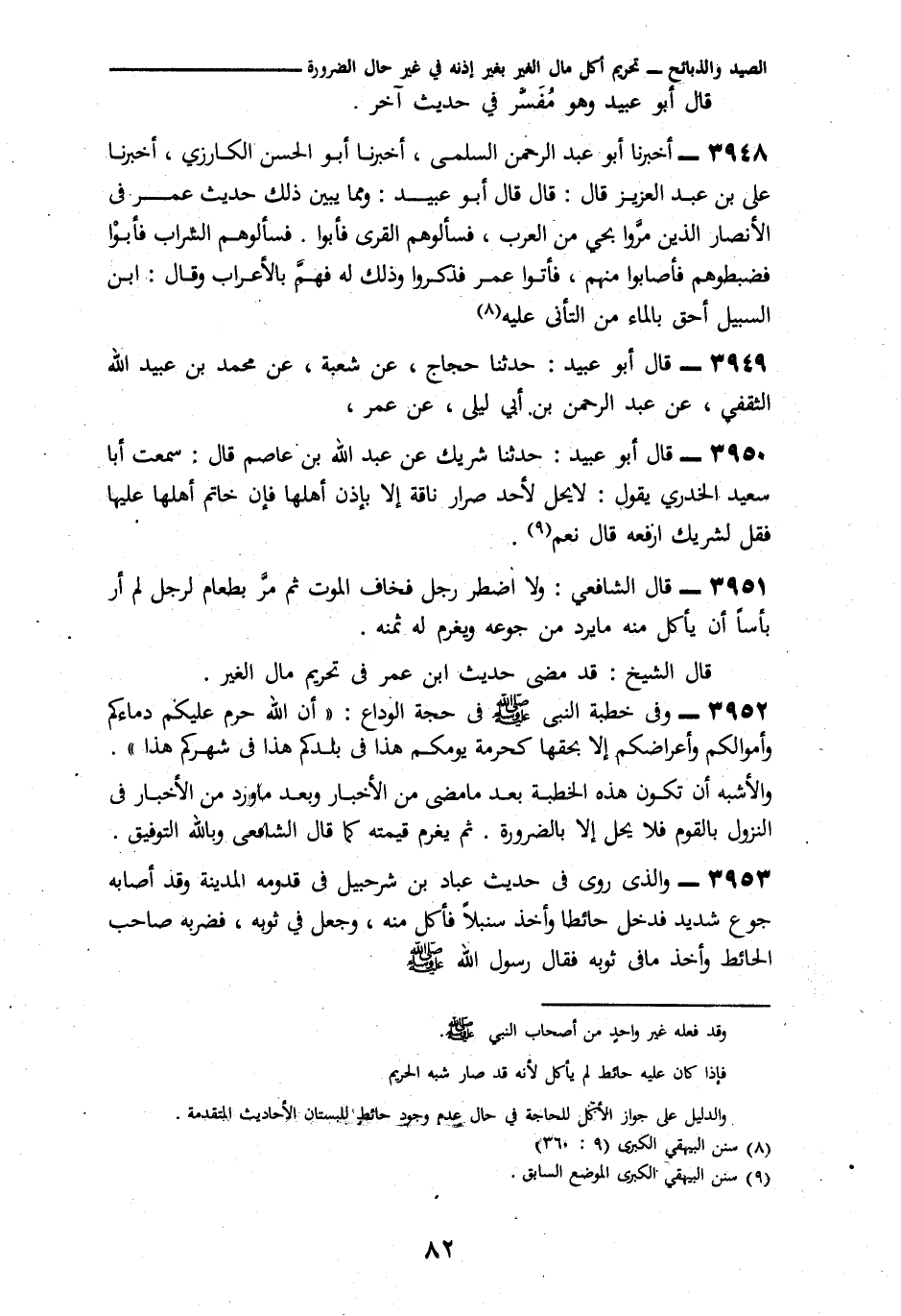 3121 - وَفِي خُطْبَةِ النَّبِيِّ صَلَّى اللهُ عَلَيْهِ وَسَلَّمَ فِي حَجَّةِ الْوَدَاعِ: § «إِنَّ اللَّهَ حَرَّمَ عَلَيْكُمْ دِمَاءَكُمْ وَأَمْوَالَكُمْ وَأَعْرَاضَكُمْ إِلَّا بِحَقِّهَا كَحُرْمَةِ يَوْمِكُمْ هَذَا فِي بَلَدِكُمْ هَذَا فِي شَهْرِكُمْ هَذَا» وَالْأَشْبَهُ أَنْ تَكُونَ هَذِهِ الْخُطْبَةُ بَعْدَمَا مَضَى مِنَ الْأَخْبَارِ وَبَعْدَمَا وَرَدَ مِنَ الْأَخْبَارِ فِي النُّزُولِ بِالْقَوْمِ فَلَا يَحِلُّ إِلَّا بِالضَّرُورَةِ. ثُمَّ يَغْرَمُ قِيمَتَهُ كَمَا قَالَ الشَّافِعِيُّ، وَبِاللَّهِ التَّوْفِيقُ