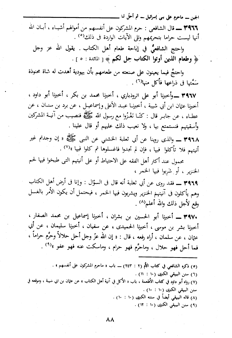 3134 - وَالَّذِي رُوِّينَا، عَنْ أَبِي ثَعْلَبَةَ الْخُشَنِيِّ، عَنِ النَّبِيِّ صَلَّى اللهُ عَلَيْهِ وَسَلَّمَ: «§إِنْ وَجَدْتُمْ غَيْرَ آنِيَتِهِمْ فَلَا تَأْكُلُوا فِيهَا، فَإِنْ لَمْ تَجِدُوا فَاغْسِلُوهَا، ثُمَّ كُلُوا فِيهَا» مَحْمُولٌ عِنْدَ أَكْثَرِ أَهْلِ الْفِقْهِ عَلَى الِاحْتِيَاطِ أَوْ عَلَى آنِيَتِهِمُ الَّتِي طَبَخُوا فِيهَا لَحْمَ الْخِنْزِيرِ، أَوْ شَرِبُوا فِيهَا الْخَمْرَ. فَقَدْ رُوِيَ عَنْ أَبِي ثَعْلَبَةَ أَنَّهُ قَالَ فِي السُّؤَالِ، وَإِنَّا فِي أَرْضِ أَهْلِ الْكِتَابِ وَهُمْ يَأْكُلُونَ فِي آنِيَتِهِمُ الْخِنْزِيرَ وَيَشْرَبُونَ فِيهَا الْخَمْرَ، فَيُحْتَمَلَ أَنْ يَكُونَ الْأَمْرُ بِالْغُسْلِ وَقَعَ لِأَجْلِ ذَلِكَ، وَاللَّهُ أَعْلَمُ