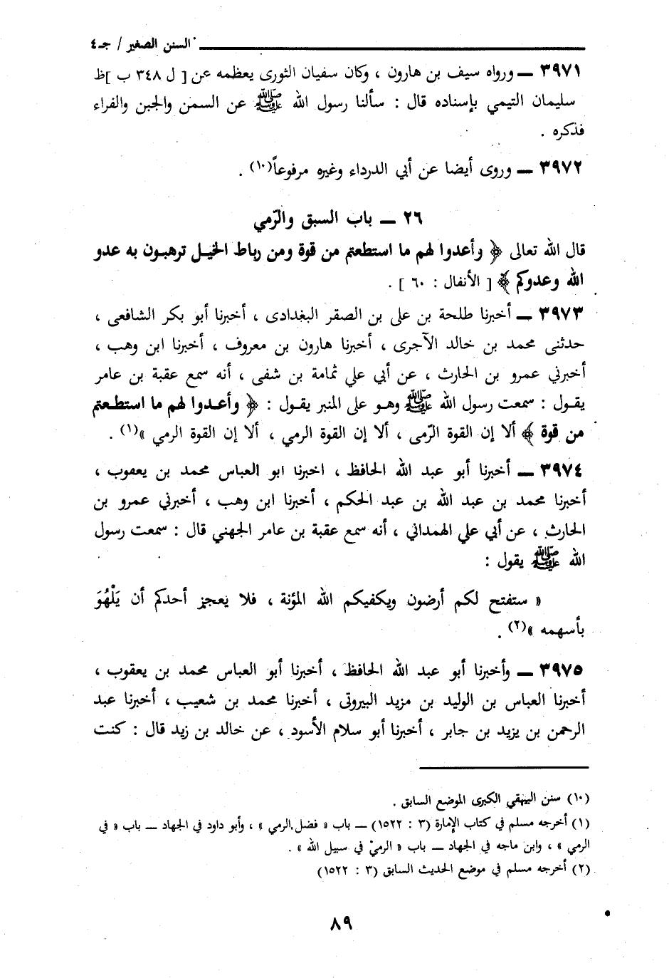 3138 - وَأَخْبَرَنَا أَبُو عَبْدِ اللَّهِ الْحَافِظُ، أنا أَبُو الْعَبَّاسِ مُحَمَّدُ بْنُ يَعْقُوبَ، أنا الْعَبَّاسُ بْنُ الْوَلِيدِ بْنِ مَزِيدٍ الْبَيْرُوتِيُّ، أنا مُحَمَّدُ بْنُ شُعَيْبٍ، أنا عَبْدُ الرَّحْمَنِ بْنُ يَزِيدَ بْنِ جَابِرٍ، أنا أَبُو سَلَّامٍ الْأَسْوَدُ، عَنْ خَالِدِ بْنِ زَيْدٍ، قَالَ: كُنْتُ -[90]- رَجُلًا رَامِيًا أُرَامِي عُقْبَةَ بْنَ عَامِرٍ، فَمَرَّ بِي ذَاتَ يَوْمٍ، فَقَالَ: يَا خَالِدُ، اخْرُجْ بِنَا نَرْمِي، فَأَبْطَأْتُ عَلَيْهِ، فَقَالَ: يَا خَالِدُ، تَعَالَ أُحَدِّثْكَ مَا حَدَّثَنِي رَسُولُ اللَّهِ صَلَّى اللهُ عَلَيْهِ وَسَلَّمَ، أَوْ أَقُولُ لَكَ كَمَا قَالَ رَسُولُ اللَّهِ صَلَّى اللهُ عَلَيْهِ وَسَلَّمَ، قَالَ رَسُولُ اللَّهِ صَلَّى اللهُ عَلَيْهِ وَسَلَّمَ: §" إِنَّ اللَّهَ عَزَّ وَجَلَّ يُدْخِلُ بِالسَّهْمِ الْوَاحِدِ ثَلَاثَةَ نَفَرٍ الْجَنَّةَ: صَانِعَهُ الَّذِي احْتَسَبَ فِي صَنْعَتِهِ الْخَيْرَ، وَمُنْبِلَهُ، وَالرَّامِيَ، ارْمُوا وَارْكَبُوا، وَأَنْ تَرْمُوا أَحَبُّ إِلَيَّ مِنْ أَنْ تَرْكَبُوا، وَلَيْسَ مِنَ اللَّهْوِ إِلَّا ثَلَاثَةٌ: تَأْدِيبُ الرَّجُلِ فَرَسَهُ، وَمُلَاعَبَتُهُ زَوْجَتَهُ، وَرَمْيُهُ بِنَبْلِهِ عَنْ قَوْسِهِ، وَمَنْ عُلِّمَ الرَّمْيَ ثُمَّ تَرَكَهُ فَهِيَ نِعْمَةٌ كَفَرَهَا " قَالَ الشَّيْخُ: وَقَوْلُهُ: لَيْسَ مِنَ اللَّهْوِ إِلَّا ثَلَاثَةٌ " يَعْنِي: لَيْسَ مِنَ اللَّهْوِ الْمُبَاحِ الْمَنْدُوبِ إِلَيْهِ إِلَّا ثَلَاثَةٌ، وَاللَّهُ أَعْلَمُ