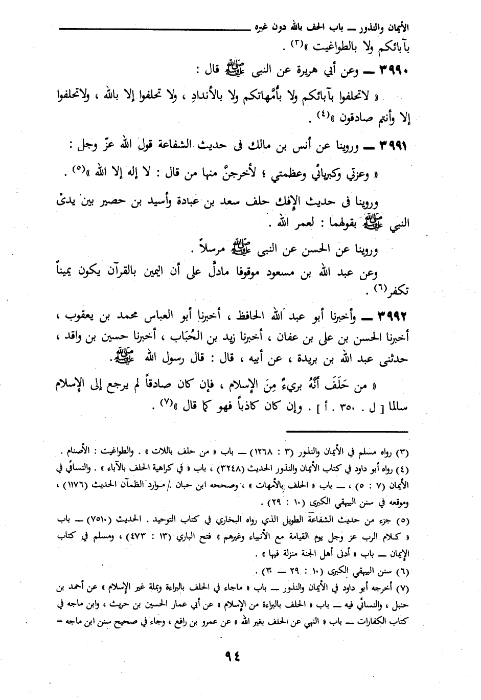 3148 - وَرُوِّينَا عَنْ أَنَسِ بْنِ مَالِكٍ، فِي حَدِيثِ الشَّفَاعَةِ قَوْلَ اللَّهِ عَزَّ وَجَلَّ: " §وَعِزَّتِي وَكِبْرِيَائِي وَعَظَمَتِي، لَأُخْرِجَنَّ مِنْهَا مَنْ قَالَ: لَا إِلَهَ إِلَّا اللَّهُ " وَرُوِّينَا فِي حَدِيثِ الْإِفْكِ حَلِفَ سَعْدِ بْنِ عُبَادَةَ وَأُسَيْدِ بْنِ حُضَيْرٍ بَيْنَ يَدَيِ النَّبِيِّ صَلَّى اللهُ عَلَيْهِ وَسَلَّمَ بِقَوْلِهِمَا: لَعَمْرُ اللَّهِ وَرُوِّينَا عَنِ الْحَسَنِ، عَنِ النَّبِيِّ صَلَّى اللهُ عَلَيْهِ وَسَلَّمَ مُرْسَلًا وَعَنْ عَبْدِ اللَّهِ بْنِ مَسْعُودٍ، مَوْقُوفًا مَا دَلَّ عَلَى أَنَّ الْيَمِينِ بِالْقُرْآنِ يَكُونُ يَمِينًا تُكَفَّرُ