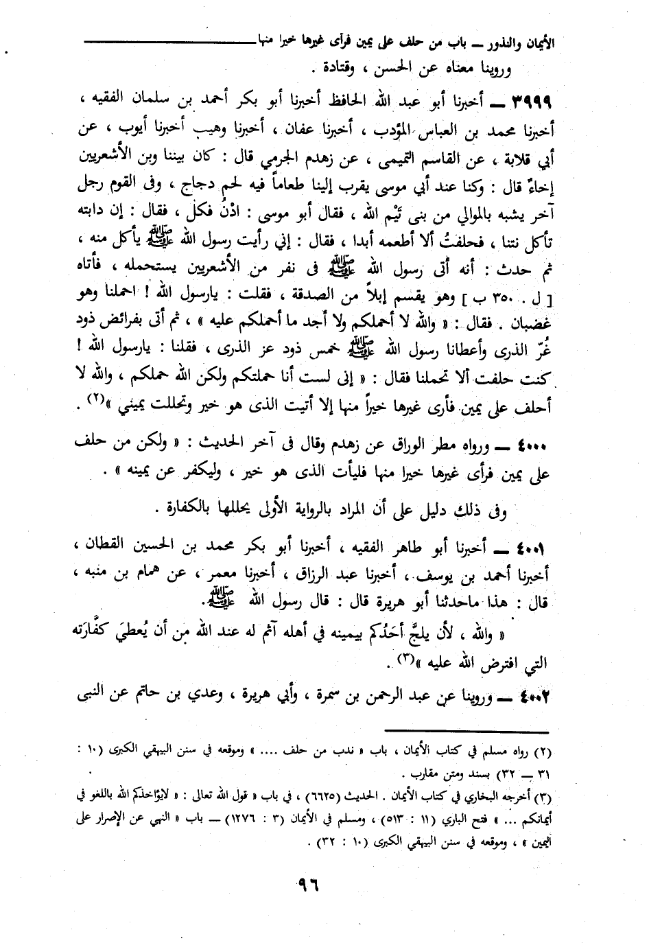 3155 - وَرُوِّينَا، عَنْ عَبْدِ الرَّحْمَنِ بْنِ سَمُرَةَ، وَأَبِي هُرَيْرَةَ، وَعَدِيِّ بْنِ حَاتِمٍ، عَنِ النَّبِيِّ صَلَّى اللهُ عَلَيْهِ وَسَلَّمَ -[97]-: § «فَلْيَأْتِ الَّذِي هُوَ خَيْرٌ وَلْيُكَفِّرْ عَنْ يَمِينِهِ» وَفِي رِوَايَةٍ أُخْرَى عَنْ كُلِّ وَاحِدٍ، مِنْهُمْ «فَلْيُكَفِّرْ عَنْ يَمِينِهِ، وَلْيَأْتِ الَّذِي، هُوَ خَيْرٌ» وَقَالَ أَبُو دَاوُدَ السِّجِسْتَانِيُّ: الْأَحَادِيثُ كُلُّهَا عَنِ النَّبِيِّ صَلَّى اللهُ عَلَيْهِ وَسَلَّمَ: «وَلْيُكَفِّرْ عَنْ يَمِينِهِ» إِلَّا مَا لَا يُعْبَأُ بِهِ "