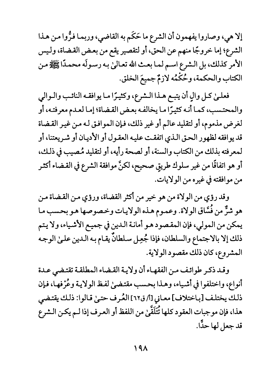 وقد رؤي من الولاة من هو خير من أكثر القضاة، ورؤي من القضاة من هو شرٌّ من فُسَّاق الولاة. وعموم هذه الولايات وخصوصها هو بحسب ما يمكن من المولي، فإن المقصود هو أمانة الدين في جميع الأشياء، ولا يتم ذلك إلا بالاجتماع والسلطان، فإذا جُعِل سلطانٌ يقام به الدين على الوجه المشروع، كان ذلك مقصود الولاية.