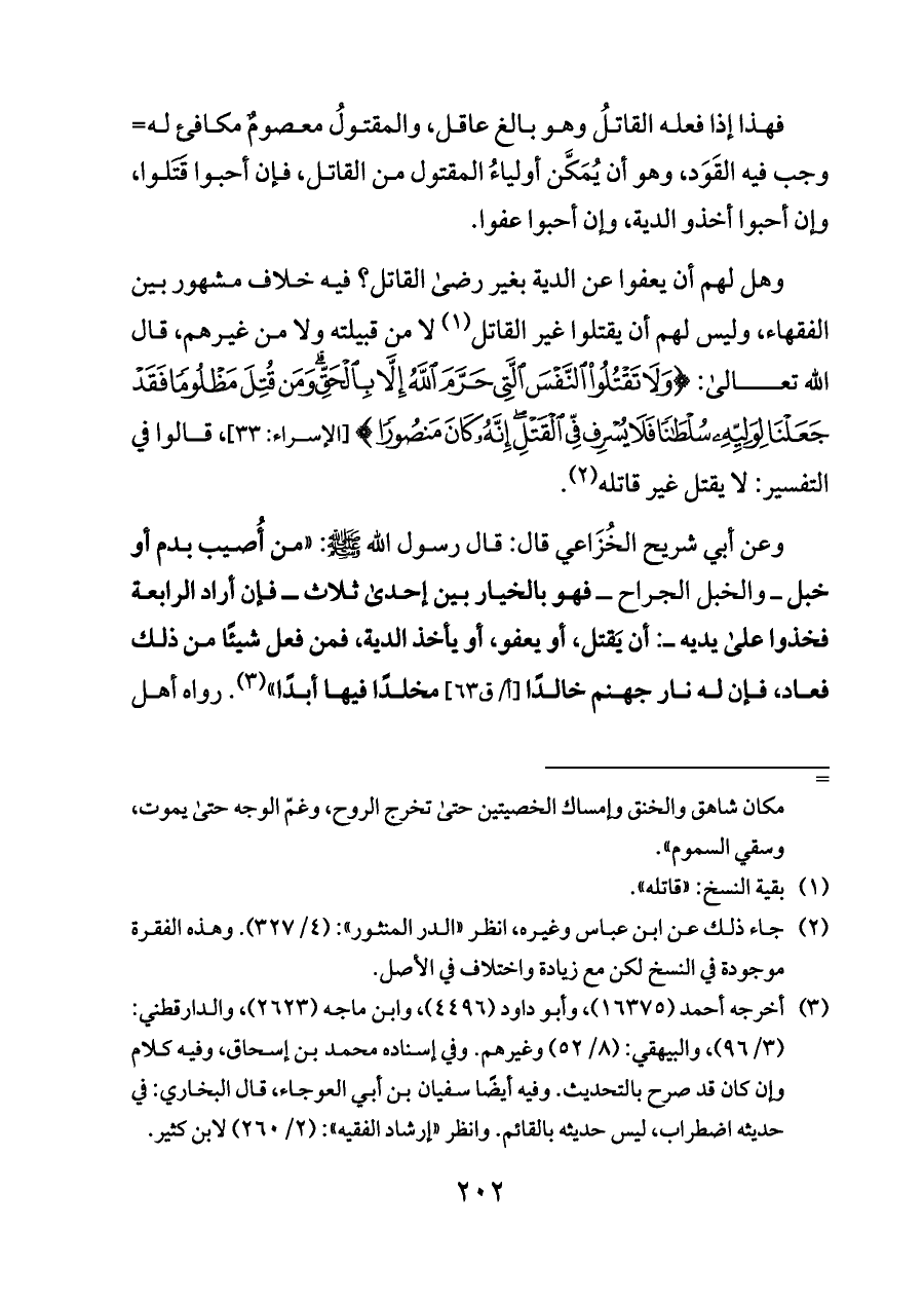 وهل لهم أن يعفوا عن الدية بغير رضى القاتل؟ فيه خلاف مشهور بين الفقهاء، وليس لهم أن يقتلوا غير القاتل (¬١) لا من قبيلته ولا من غيرهم، قال الله تعالى: {وَلَا تَقْتُلُوا النَّفْسَ الَّتِي حَرَّمَ اللَّهُ إِلَّا بِالْحَقِّ وَمَنْ قُتِلَ مَظْلُومًا فَقَدْ جَعَلْنَا لِوَلِيِّهِ سُلْطَانًا فَلَا يُسْرِفْ فِي الْقَتْلِ إِنَّهُ كَانَ مَنْصُورًا} [الإسراء: ٣٣]، قالوا في التفسير: لا يقتل غير قاتله (¬٢).