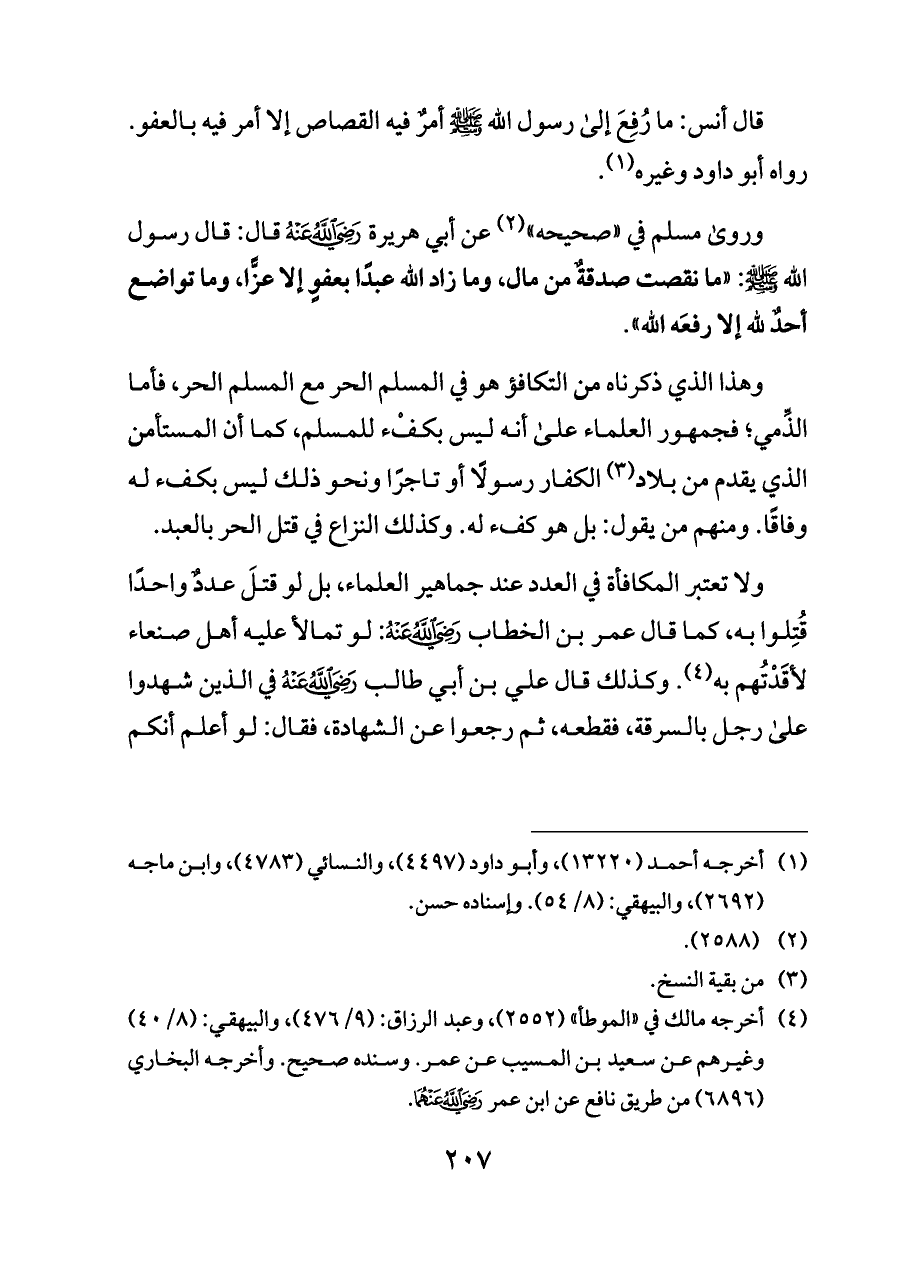 ولا تعتبر المكافأة في العدد عند جماهير العلماء، بل لو قتلَ عددٌ واحدًا قُتِلوا به، كما قال عمر بن الخطاب - رضي الله عنه -: لو تمالأ عليه أهل صنعاء لأقَدْتُهم به (¬٤). وكذلك قال علي بن أبي طالب - رضي الله عنه - في الذين شهدوا على رجل بالسرقة، فقطعه، ثم رجعوا عن الشهادة، فقال: لو أعلم أنكم