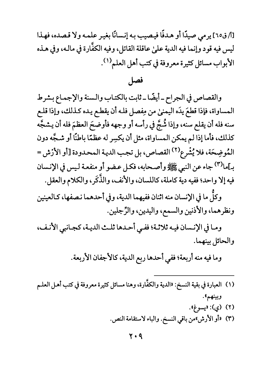 (¬١) العبارة في بقية النسخ: «الدية والكفَّارة، وهنا مسائل كثيرة معروفة في كتب أهل العلم وبينهم».