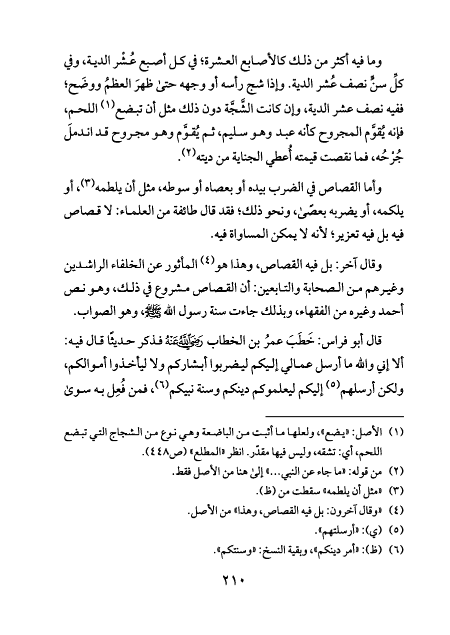 وقال آخر: بل فيه القصاص، وهذا هو (¬٤) المأثور عن الخلفاء الراشدين وغيرهم من الصحابة والتابعين: أن القصاص مشروع في ذلك، وهو نص أحمد وغيره من الفقهاء، وبذلك جاءت سنة رسول الله - صلى الله عليه وسلم -، وهو الصواب.