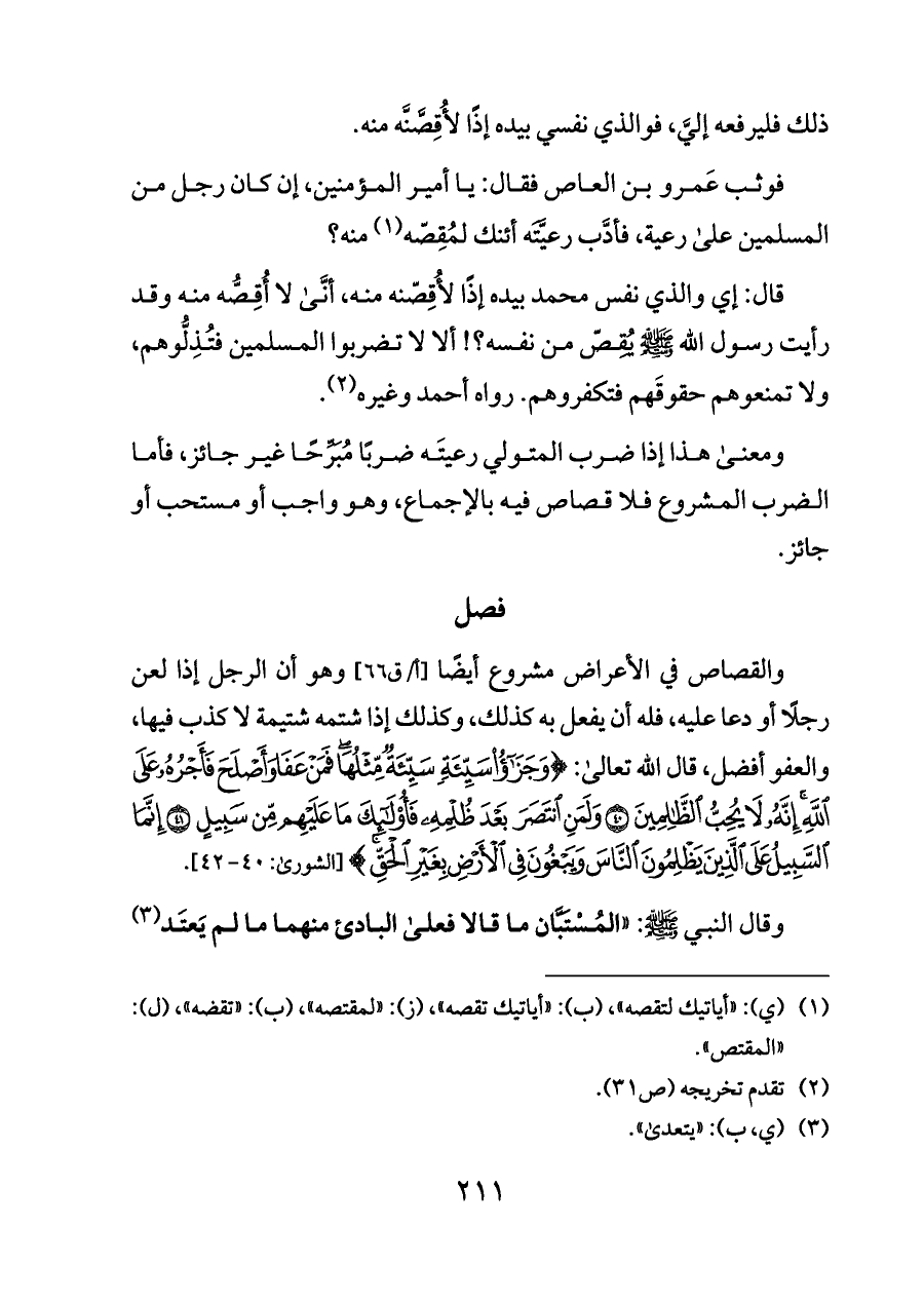 والقصاص في الأعراض مشروع أيضًا [أ/ق ٦٦] وهو أن الرجل إذا لعن رجلًا أو دعا عليه، فله أن يفعل به كذلك، وكذلك إذا شتمه شتيمة لا كذب فيها، والعفو أفضل، قال الله تعالى: {وَجَزَاءُ سَيِّئَةٍ سَيِّئَةٌ مِثْلُهَا فَمَنْ عَفَا وَأَصْلَحَ فَأَجْرُهُ عَلَى اللَّهِ إِنَّهُ لَا يُحِبُّ الظَّالِمِينَ (٤٠) وَلَمَنِ انْتَصَرَ بَعْدَ ظُلْمِهِ فَأُولَئِكَ مَا عَلَيْهِمْ مِنْ سَبِيلٍ (٤١) إِنَّمَا السَّبِيلُ عَلَى الَّذِينَ يَظْلِمُونَ النَّاسَ وَيَبْغُونَ فِي الْأَرْضِ بِغَيْرِ الْحَقِّ} [الشورى: ٤٠ - ٤٢].