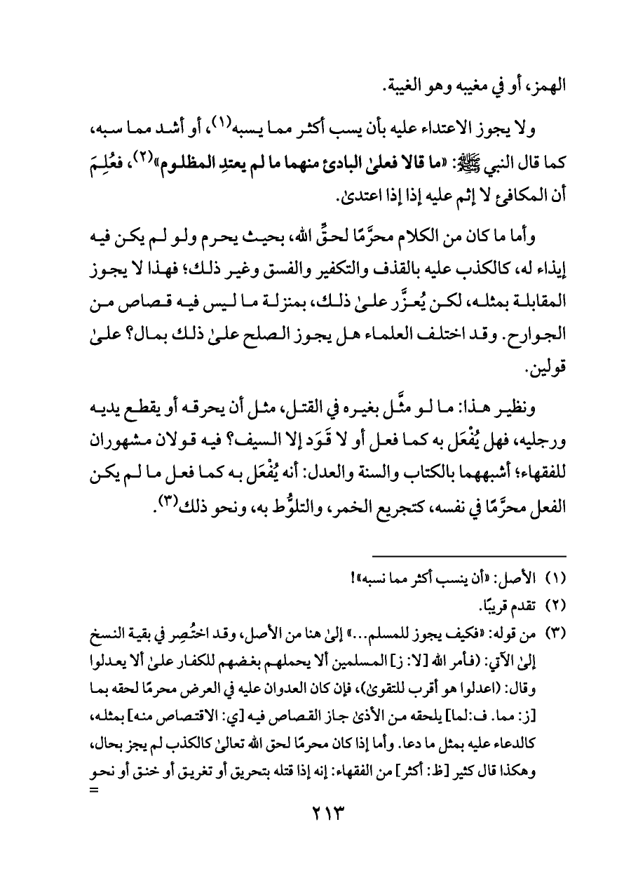 ولا يجوز الاعتداء عليه بأن يسب أكثر مما يسبه (¬١)، أو أشد مما سبه، كما قال النبي - صلى الله عليه وسلم -: «ما قالا فعلى البادئ منهما ما لم يعتدِ المظلوم» (¬٢)، فعُلِمَ أن المكافئ لا إثم عليه إذا إذا اعتدى.