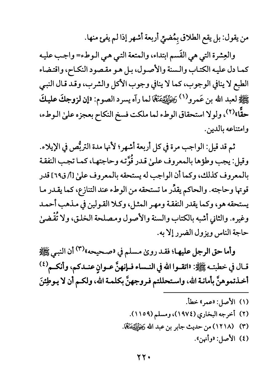 والعِشرة التي هي القَسم ابتداء، والمتعة التي هي الوطء= واجب عليه كما دل عليه الكتاب والسنة والأصول، بل هو مقصود النكاح، واقتضاء الطبع لا ينافي الوجوب، كما لا ينافي وجوب الأكل والشرب، وقد قال النبي - صلى الله عليه وسلم - لعبد الله بن عَمرو (¬١) - رضي الله عنهما - لما رآه يسرد الصوم: «إن لزوجكَ عليكَ حقًّا» (¬٢)، ولولا استحقاق الوطء لما ملكت فسخ النكاح بعجزه على الوطء، وامتناعه بالدين.