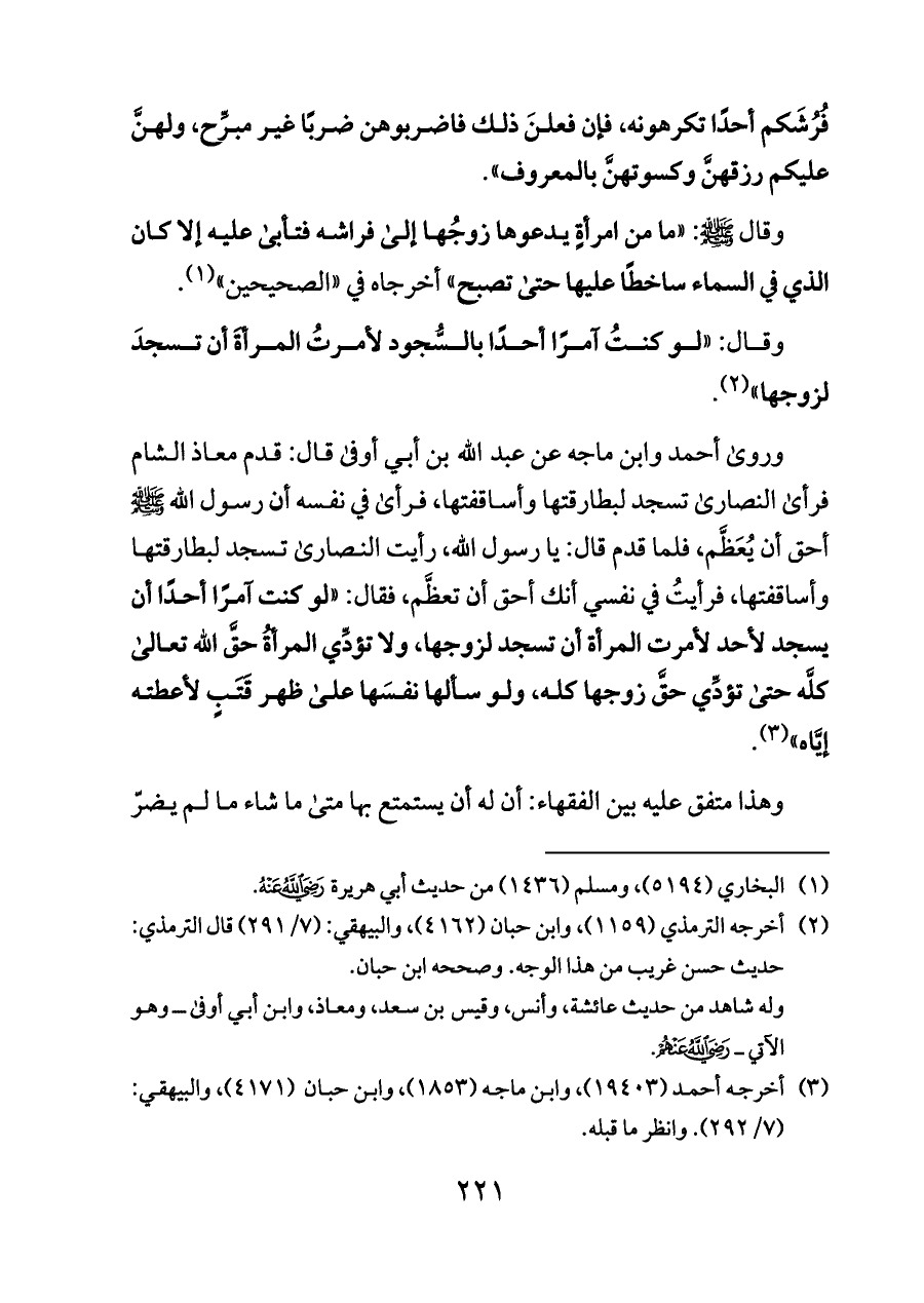 وروى أحمد وابن ماجه عن عبد الله بن أبي أوفى قال: قدم معاذ الشام فرأى النصارى تسجد لبطارقتها وأساقفتها، فرأى في نفسه أن رسول الله - صلى الله عليه وسلم - أحق أن يُعَظَّم، فلما قدم قال: يا رسول الله، رأيت النصارى تسجد لبطارقتها وأساقفتها، فرأيتُ في نفسي أنك أحق أن تعظَّم، فقال: «لو كنت آمرًا أحدًا أن يسجد لأحد لأمرت المرأة أن تسجد لزوجها، ولا تؤدِّي المرأةُ حقَّ الله تعالى كلَّه حتى تؤدِّي حقَّ زوجها كله، ولو سألها نفسَها على ظهر قَتَبٍ لأعطته إيَّاه» (¬٣).
