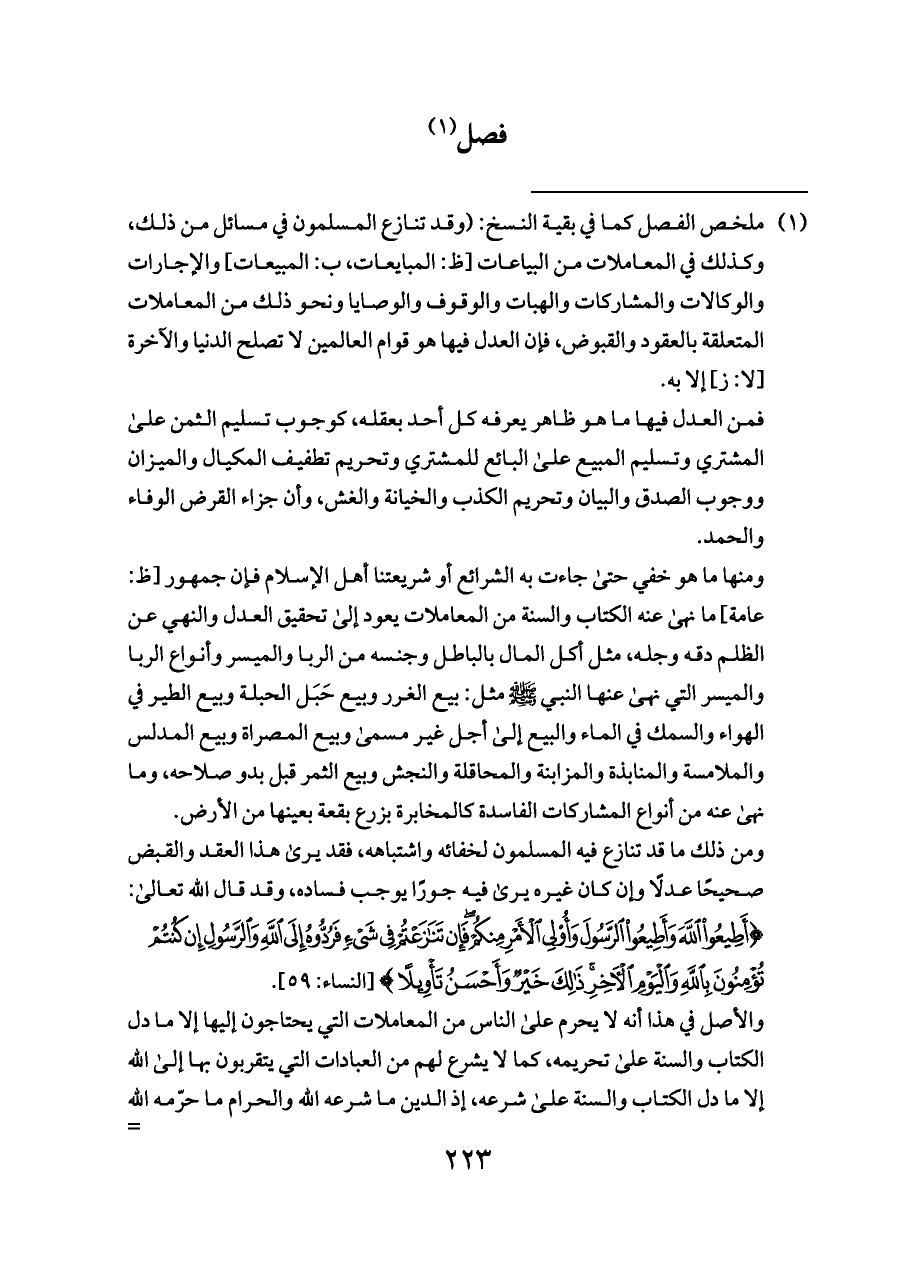 (¬١) ملخص الفصل كما في بقية النسخ: (وقد تنازع المسلمون في مسائل من ذلك، وكذلك في المعاملات من البياعات [ظ: المبايعات، ب: المبيعات] والإجارات والوكالات والمشاركات والهبات والوقوف والوصايا ونحو ذلك من المعاملات المتعلقة بالعقود والقبوض، فإن العدل فيها هو قوام العالمين لا تصلح الدنيا والآخرة [لا: ز] إلا به.