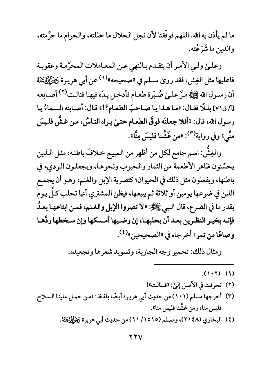 وعلى ولي الأمر أن يتقدم بالنهي عن المعاملات المحرَّمة وعقوبة فاعليها مثل الغِش، فقد روى مسلم في «صحيحه» (¬١) عن أبي هريرة - رضي الله عنه - أن رسول الله - صلى الله عليه وسلم - مرَّ على صُبْرة طعام فأدخل يدَه فيها فنالت (¬٢) أصابعه [أ/ق ٧١] بللًا فقال: «ما هذا يا صاحبَ الطعام؟!» قال: أصابته السماءُ يا رسول الله، قال: «أفلا جعلتَه فوقَ الطعام حتى يراه الناسُ، من غشَّ فليسَ منِّي» وفي رواية (¬٣): «من غَشَّنا فليسَ مِنَّا».
