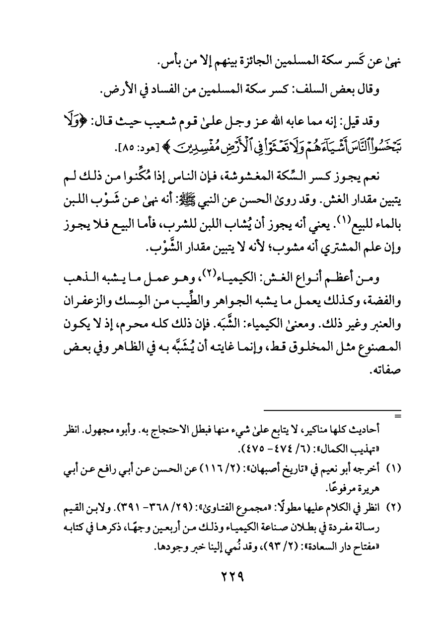 ومن أعظم أنواع الغش: الكيمياء (¬٢)، وهو عمل ما يشبه الذهب والفضة، وكذلك يعمل ما يشبه الجواهر والطِّيب من المِسك والزعفران والعنبر وغير ذلك. ومعنى الكيمياء: الشَّبَه. فإن ذلك كله محرم، إذ لا يكون المصنوع مثل المخلوق قط، وإنما غايته أن يُشَبَّه به في الظاهر وفي بعض صفاته.