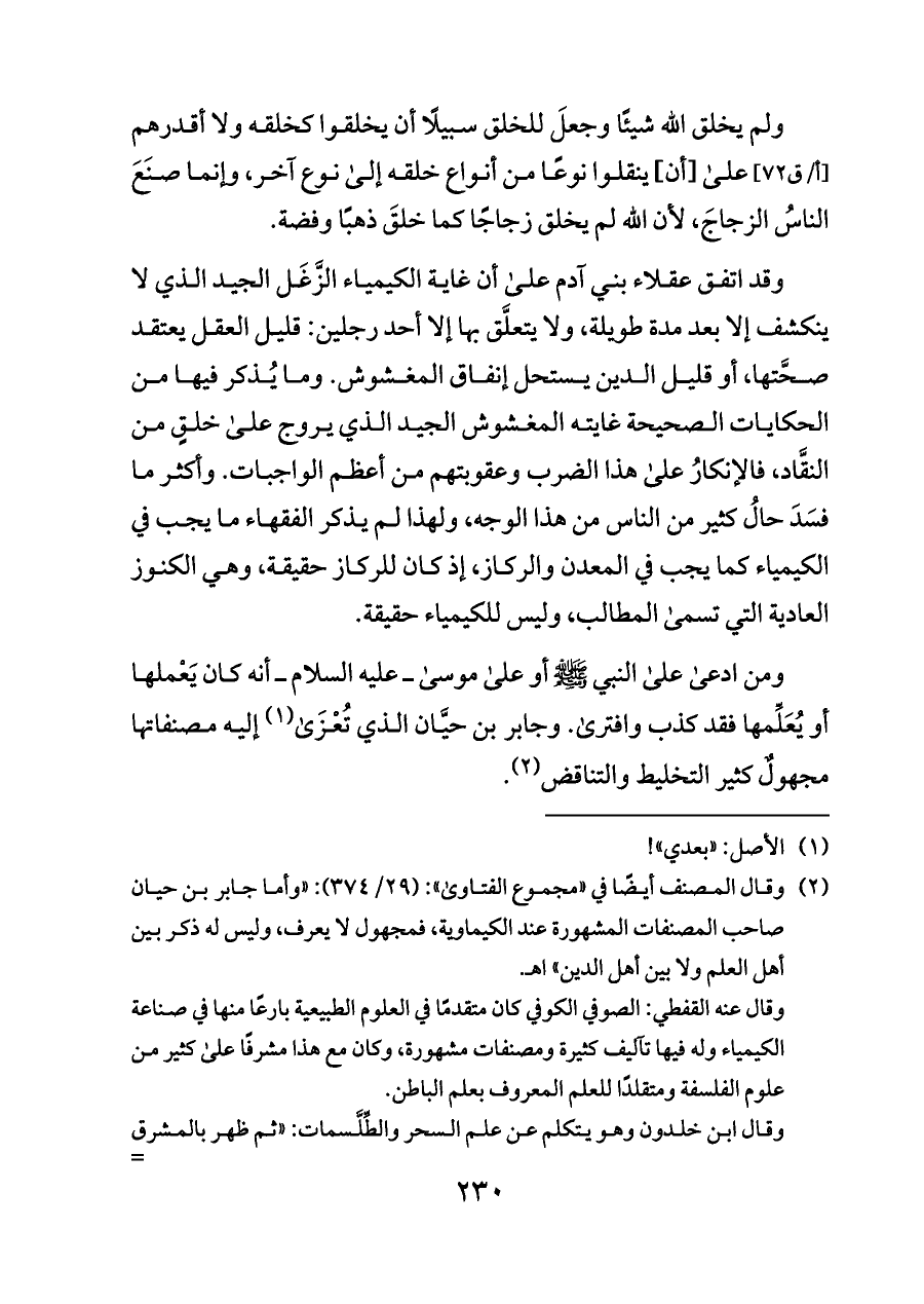 (¬٢) وقال المصنف أيضًا في «مجموع الفتاوى»: (٢٩/ ٣٧٤): «وأما جابر بن حيان صاحب المصنفات المشهورة عند الكيماوية، فمجهول لا يعرف، وليس له ذكر بين أهل العلم ولا بين أهل الدين» اهـ.