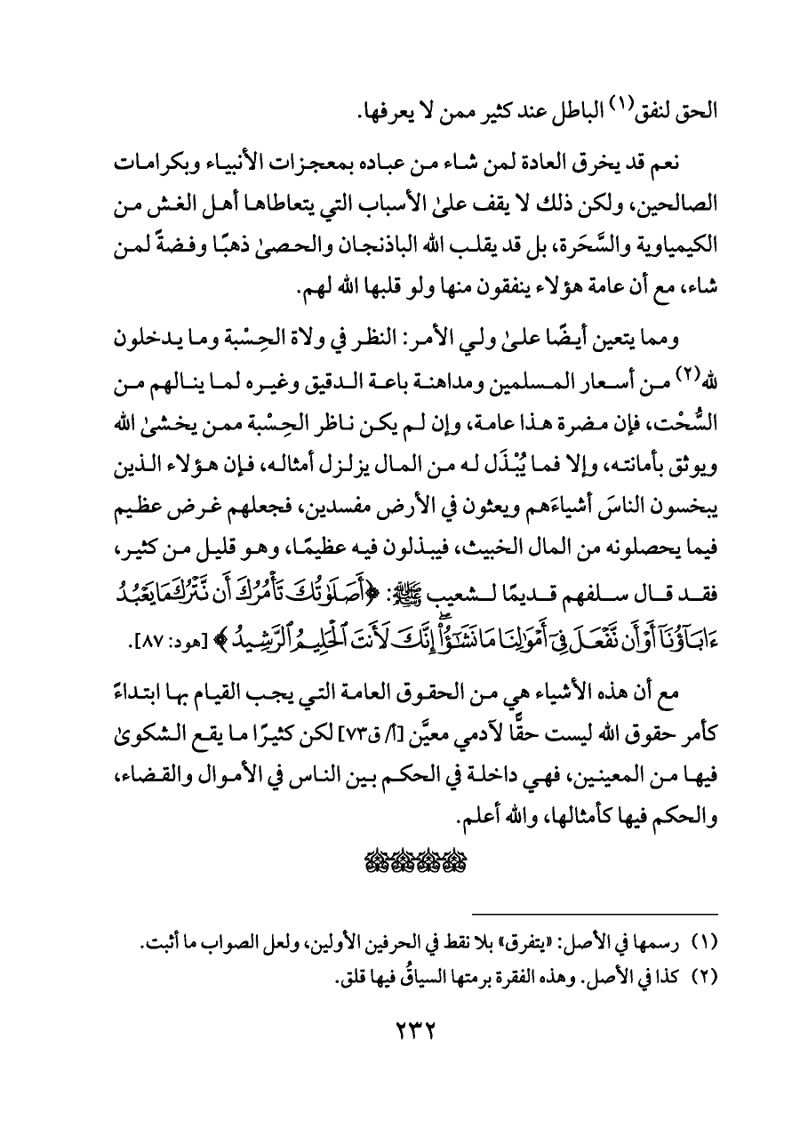 ومما يتعين أيضًا على ولي الأمر: النظر في ولاة الحِسْبة وما يدخلون لله (¬٢) من أسعار المسلمين ومداهنة باعة الدقيق وغيره لما ينالهم من السُّحْت، فإن مضرة هذا عامة، وإن لم يكن ناظر الحِسْبة ممن يخشى الله ويوثق بأمانته، وإلا فما يُبْذَل له من المال يزلزل أمثاله، فإن هؤلاء الذين يبخسون الناسَ أشياءَهم ويعثون في الأرض مفسدين، فجعلهم غرض عظيم فيما يحصلونه من المال الخبيث، فيبذلون فيه عظيمًا، وهو قليل من كثير، فقد قال سلفهم قديمًا لشعيب - صلى الله عليه وسلم -: {أَصَلَاتُكَ تَأْمُرُكَ أَنْ نَتْرُكَ مَا يَعْبُدُ آبَاؤُنَا أَوْ أَنْ نَفْعَلَ فِي أَمْوَالِنَا مَا نَشَاءُ إِنَّكَ لَأَنْتَ الْحَلِيمُ الرَّشِيدُ} [هود: ٨٧].