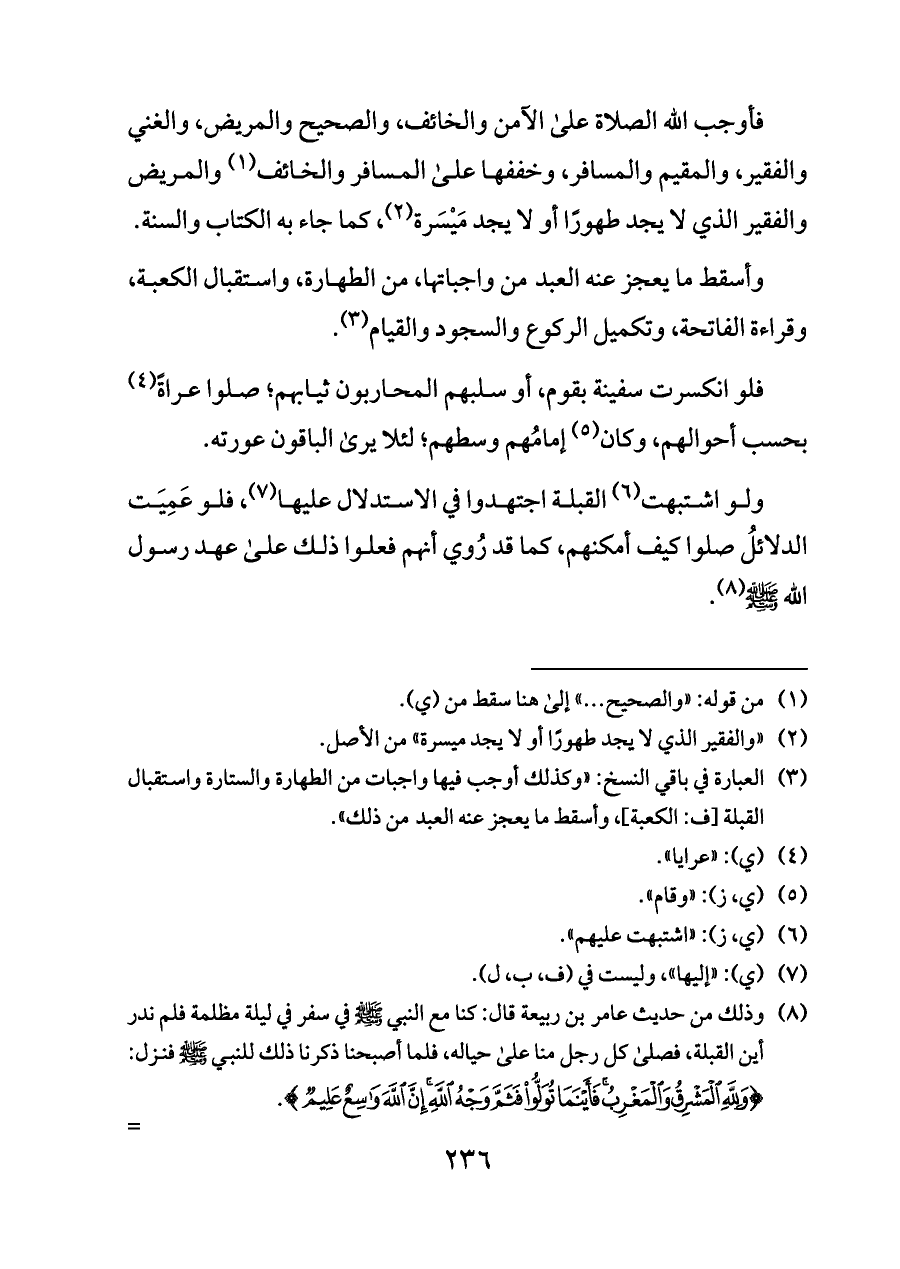 (¬٣) العبارة في باقي النسخ: «وكذلك أوجب فيها واجبات من الطهارة والستارة واستقبال القبلة [ف: الكعبة]، وأسقط ما يعجز عنه العبد من ذلك».