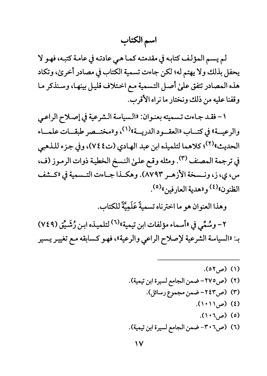 ١ - فقد جاءت تسميته بعنوان: «السياسة الشرعية في إصلاح الراعي والرعية» في كتاب «العقود الدرية» (¬١)، و «مختصر طبقات علماء الحديث» (¬٢)؛ كلاهما لتلميذه ابن عبد الهادي (ت ٧٤٤)، وفي جزء للذهبي في ترجمة المصنف (¬٣). ومثله وقع على النسخ الخطية ذوات الرموز (ف، س، ي، ز، ونسخة الأزهر ٨٧٩٣). وهكذا جاءت التسمية في «كشف الظنون» (¬٤) و «هدية العارفين» (¬٥).