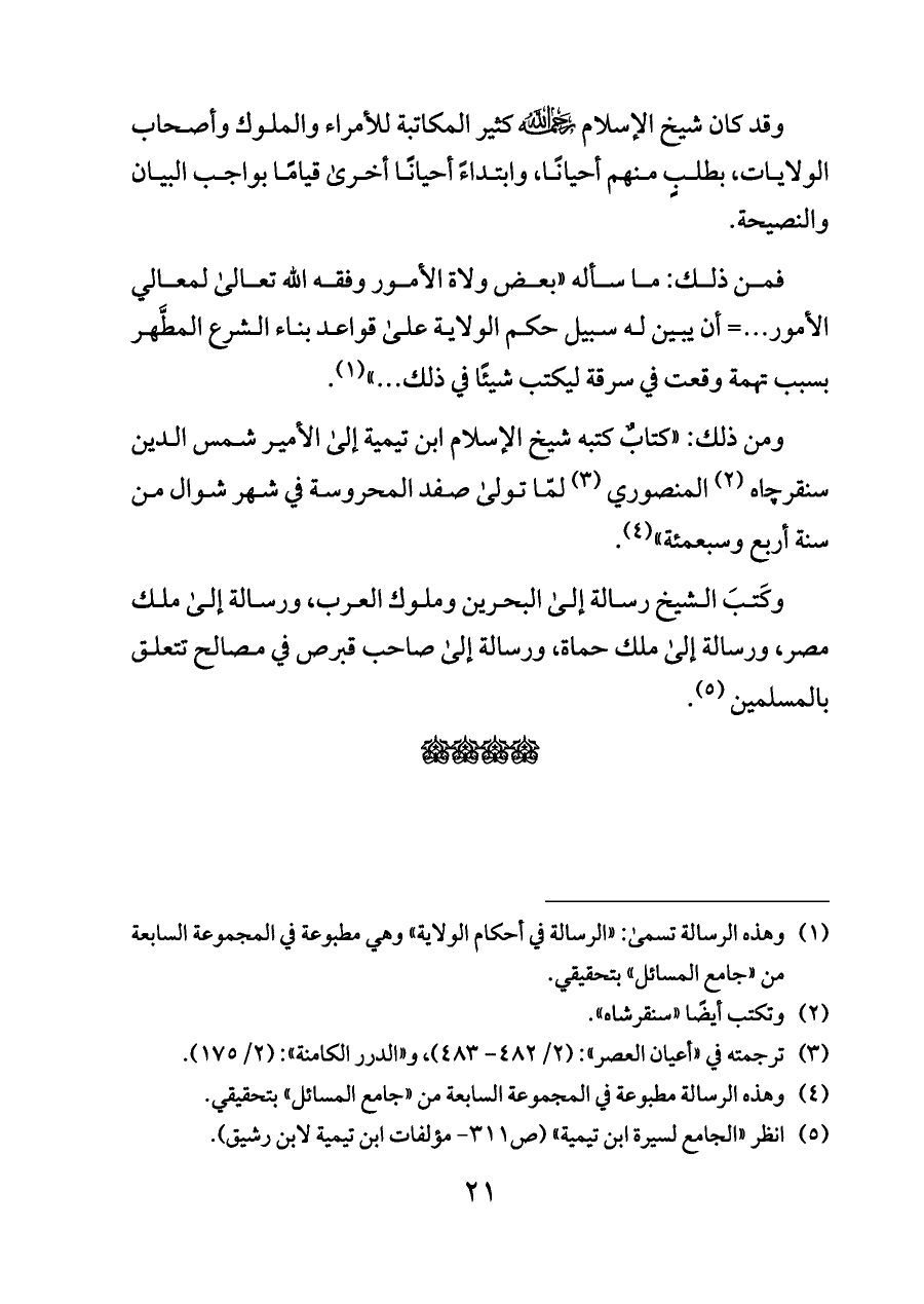 وقد كان شيخ الإسلام - رحمه الله - كثير المكاتبة للأمراء والملوك وأصحاب الولايات، بطلبٍ منهم أحيانًا، وابتداءً أحيانًا أخرى قيامًا بواجب البيان والنصيحة.