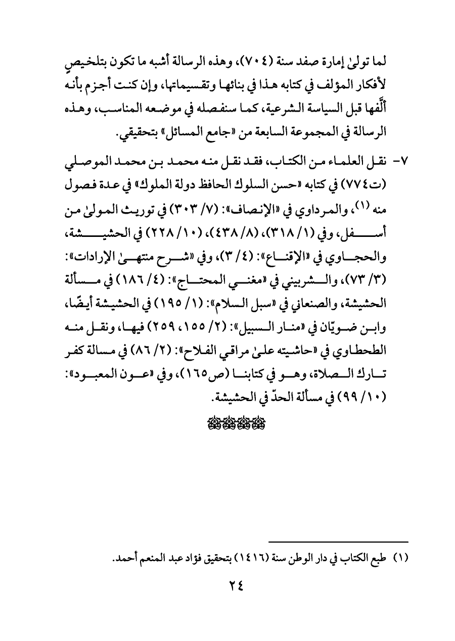 ٧ - نقل العلماء من الكتاب، فقد نقل منه محمد بن محمد الموصلي (ت ٧٧٤) في كتابه «حسن السلوك الحافظ دولة الملوك» في عدة فصول منه (¬١)، والمرداوي في «الإنصاف»: (٧/ ٣٠٣) في توريث المولى من أسفل، وفي (١/ ٣١٨)، (٨/ ٤٣٨)، (١٠/ ٢٢٨) في الحشيشة، والحجاوي في «الإقناع»: (٤/ ٣)، وفي «شرح منتهى الإرادات»: (٣/ ٧٣)، والشربيني في «مغني المحتاج»: (٤/ ١٨٦) في مسألة الحشيشة، والصنعاني في «سبل السلام»: (١/ ١٩٥) في الحشيشة أيضًا، وابن ضويّان في «منار السبيل»: (٢/ ١٥٥، ٢٥٩) فيها، ونقل منه الطحطاوي في «حاشيته على مراقي الفلاح»: (٢/ ٨٦) في مسالة كفر تارك الصلاة، وهو في كتابنا (ص ١٦٥)، وفي «عون المعبود»: (١٠/ ٩٩) في مسألة الحدّ في الحشيشة.