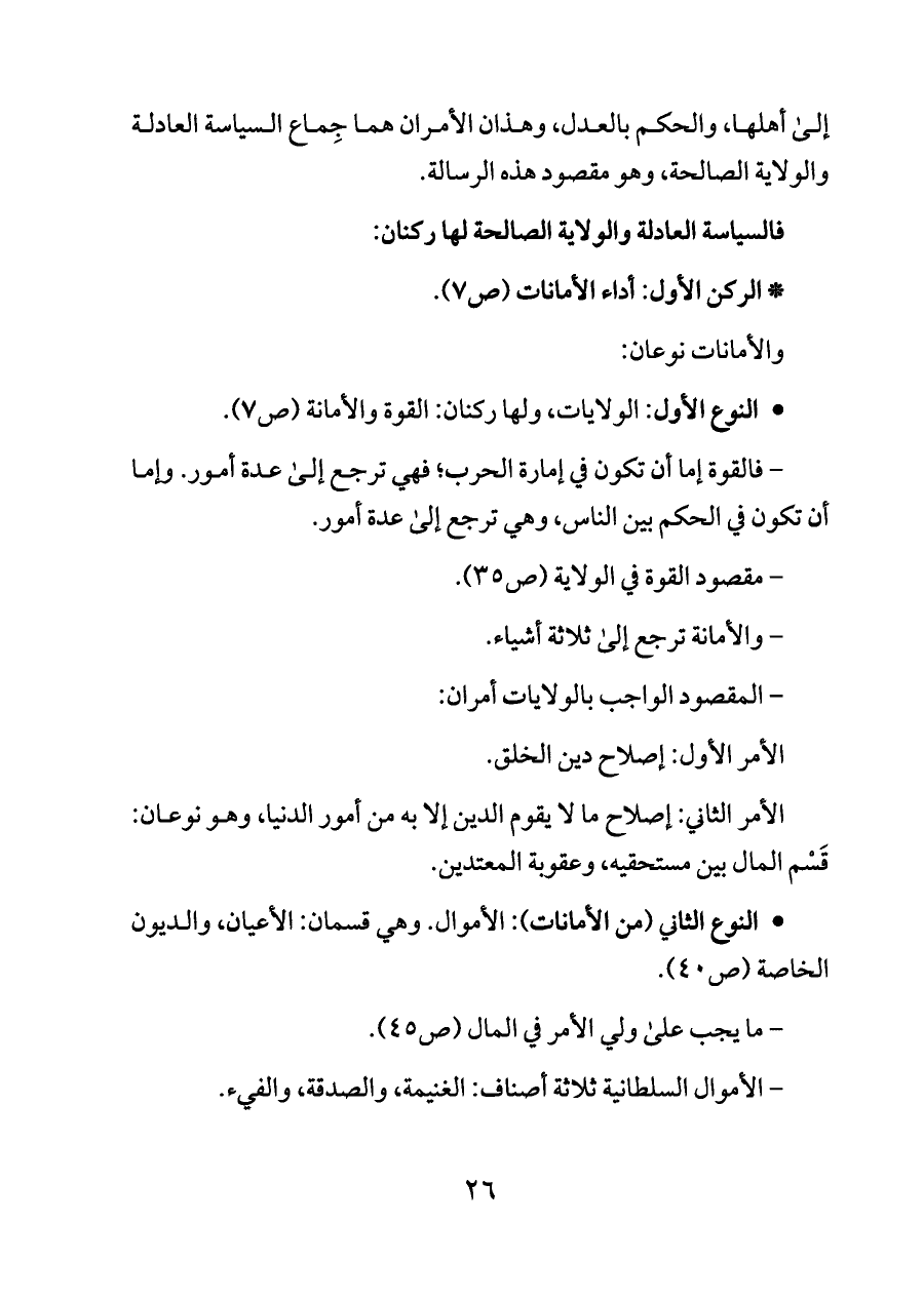 إلى أهلها، والحكم بالعدل، وهذان الأمران هما جِماع السياسة العادلة والولاية الصالحة، وهو مقصود هذه الرسالة.