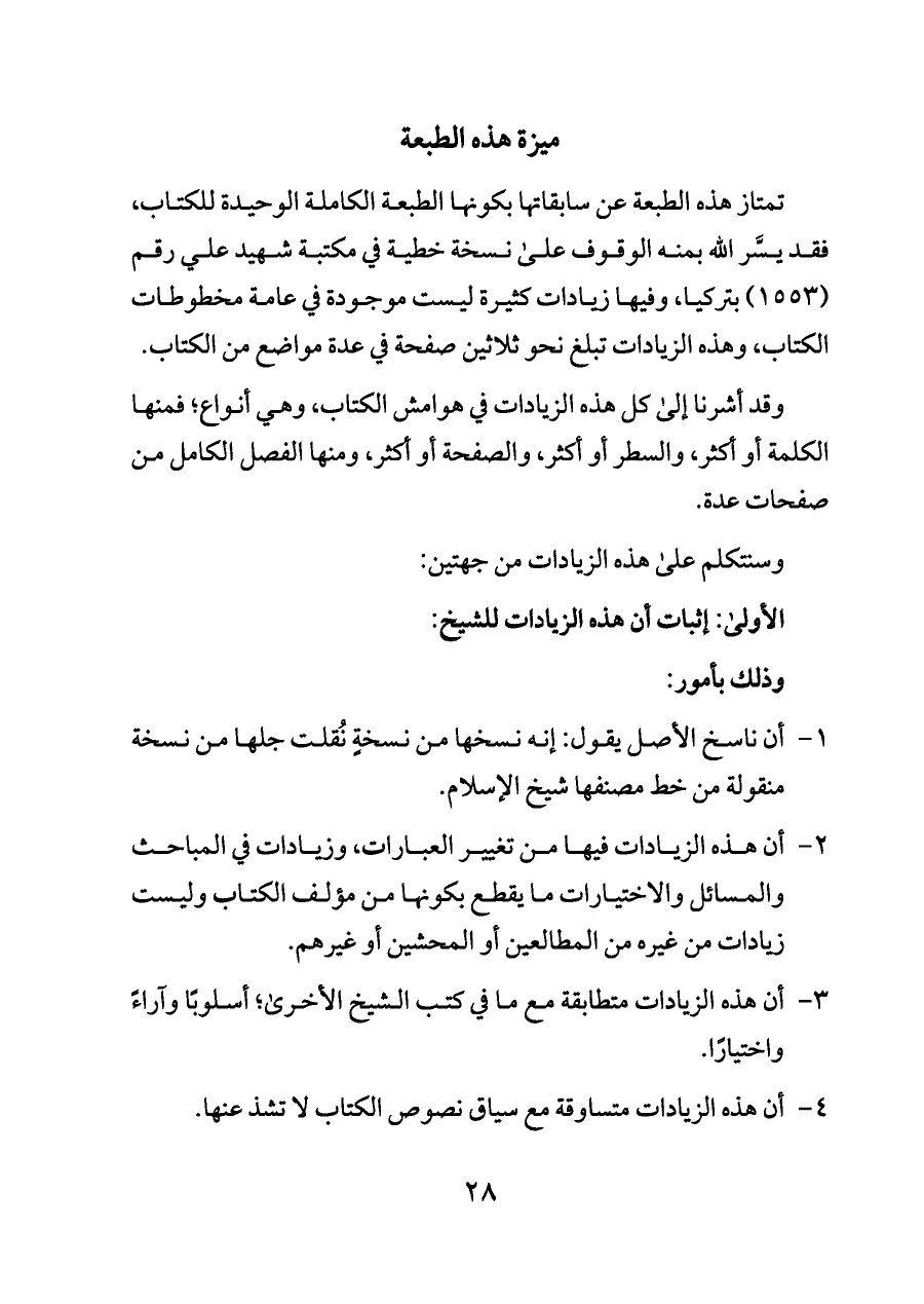 تمتاز هذه الطبعة عن سابقاتها بكونها الطبعة الكاملة الوحيدة للكتاب، فقد يسَّر الله بمنه الوقوف على نسخة خطية في مكتبة شهيد علي رقم (١٥٥٣) بتركيا، وفيها زيادات كثيرة ليست موجودة في عامة مخطوطات الكتاب، وهذه الزيادات تبلغ نحو ثلاثين صفحة في عدة مواضع من الكتاب.