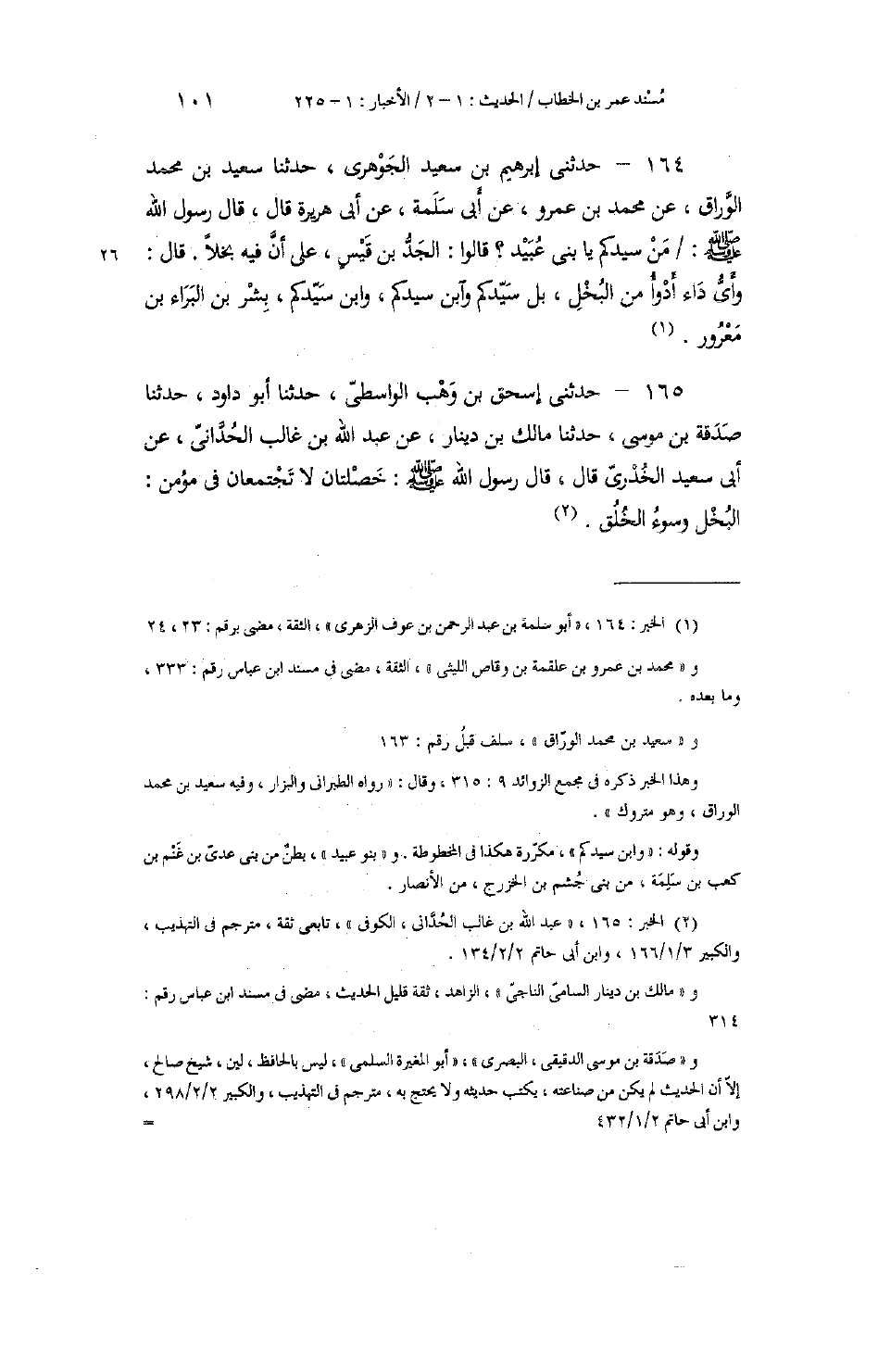 164 - حَدَّثَنِي إِبْرَاهِيمُ بْنُ سَعِيدٍ الْجَوْهَرِيُّ، حَدَّثَنَا سَعِيدُ بْنُ مُحَمَّدٍ الْوَرَّاقُ، عَنْ مُحَمَّدِ بْنِ عَمْرٍو، عَنْ أَبِي سَلَمَةَ، عَنْ أَبِي هُرَيْرَةَ، قَالَ: قَالَ رَسُولُ اللَّهِ صَلَّى اللهُ عَلَيْهِ وَسَلَّمَ: «§مَنْ سَيِّدُكُمْ يَا بَنِي عُبَيْدٍ؟» قَالُوا: الْجَدُّ بْنُ قَيْسٍ، عَلَى أَنَّ فِيهِ بُخْلًا، قَالَ: «وَأَيُّ دَاءٍ أَدْوَأُ مِنَ الْبُخْلِ، بَلْ سَيِّدُكُمْ وَابْنُ سَيِّدِكُمْ، وَابْنُ سَيِّدِكُمْ، بِشْرُ بْنُ الْبَرَاءِ بْنِ مَعْرُورٍ»