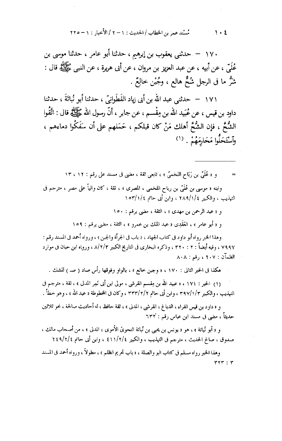171 - حَدَّثَنِي عَبْدُ اللَّهِ بْنُ أَبِي زِيَادٍ الْقَطَوَانِيُّ، حَدَّثَنَا أَبُو نُبَاتَةَ، حَدَّثَنَا دَاوُدُ بْنُ قَيْسٍ، عَنْ عُبَيْدِ اللَّهِ بْنِ مِقْسَمٍ، عَنْ جَابِرٍ أَنَّ رَسُولَ اللَّهِ صَلَّى اللهُ عَلَيْهِ وَسَلَّمَ قَالَ: «§اتَّقُوا الشُّحَّ؛ فَإِنَّ الشُّحَّ أَهْلَكَ مَنْ كَانَ قَبْلَكُمْ؛ حَمَلَهُمْ عَلَى أَنْ سَفَكُوا دِمَاءَهُمْ، وَاسْتَحَلُّوا مَحَارِمَهُمْ»