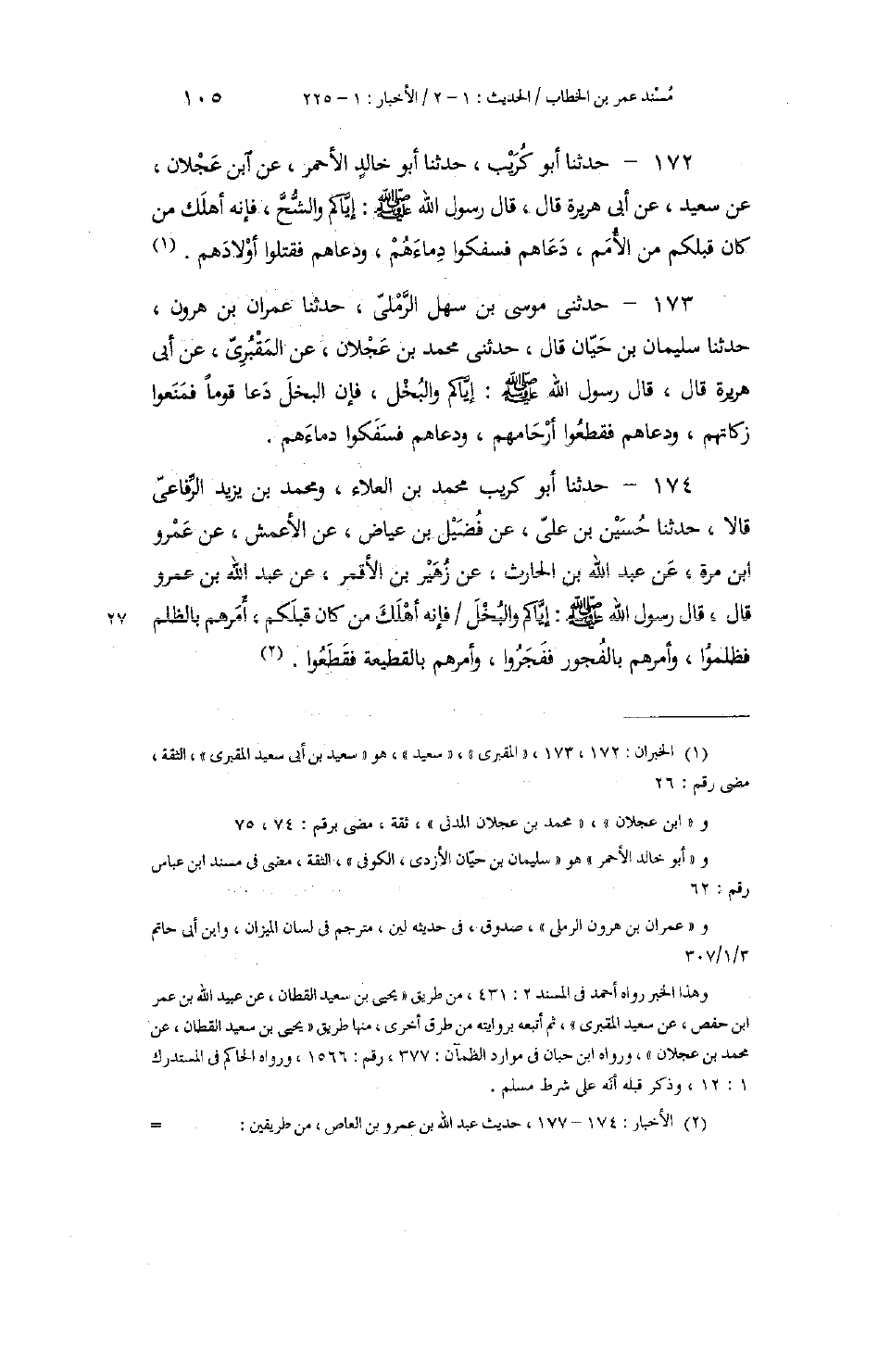 173 - حَدَّثَنِي مُوسَى بْنُ سَهْلٍ الرَّمْلِيُّ، حَدَّثَنَا عِمْرَانُ بْنُ هَارُونَ، حَدَّثَنَا سُلَيْمَانُ بْنُ حَيَّانٍ، قَالَ: حَدَّثَنِي مُحَمَّدُ بْنُ عَجْلَانَ، عَنِ الْمَقْبُرِيِّ، عَنْ أَبِي هُرَيْرَةَ، قَالَ: قَالَ رَسُولُ اللَّهِ صَلَّى اللهُ عَلَيْهِ وَسَلَّمَ: «§إِيَّاكُمْ وَالْبُخْلَ؛ فَإِنَّ الْبُخْلَ دَعَا قَوْمًا فَمَنَعُوا زَكَاتَهُمْ، وَدَعَاهُمْ فَقَطَعُوا أَرْحَامَهُمْ، وَدَعَاهُمْ فَسَفَكُوا دِمَاءَهُمْ»
