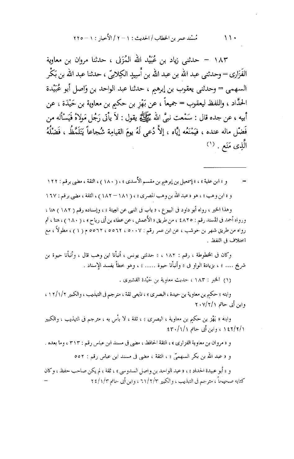 183 - حَدَّثَنِي زِيَادُ بْنُ عُبَيْدِ اللَّهِ الْمُزَنِيُّ، حَدَّثَنَا مَرْوَانُ بْنُ مُعَاوِيَةَ الْفَزَارِيُّ، وَحَدَّثَنِي عَبْدُ اللَّهِ بْنُ عَبْدِ اللَّهِ بْنِ أَسِيدٍ الْكِلَابِيُّ، حَدَّثَنَا عَبْدُ اللَّهِ بْنُ بَكْرٍ السَّهْمِيُّ، وَحَدَّثَنِي يَعْقُوبُ بْنُ إِبْرَاهِيمَ، حَدَّثَنَا عَبْدُ الْوَاحِدِ بْنُ وَاصِلٍ أَبُو عُبَيْدَةَ الْحَدَّادُ - وَاللَّفْظُ لِيَعْقُوبَ - جَمِيعًا عَنْ بَهْزِ بْنِ حَكِيمِ بْنِ مُعَاوِيَةَ بْنِ حَيْدَةَ، عَنْ أَبِيهِ، عَنْ جَدِّهِ، قَالَ: سَمِعْتُ نَبِيَّ اللَّهِ صَلَّى اللهُ عَلَيْهِ وَسَلَّمَ يَقُولُ: «§لَا يَأْتِي رَجُلٌ مَوْلَاهُ فَيَسْأَلُهُ مِنْ فَضْلِ مَالِهِ عِنْدَهُ، فَيَمْنَعُهُ إِيَّاهُ، إِلَّا دُعِيَ لَهُ يَوْمَ الْقِيَامَةِ شُجَاعًا يَتَلَمَّظُ فَضْلَهُ الَّذِي مَنَعَ»
