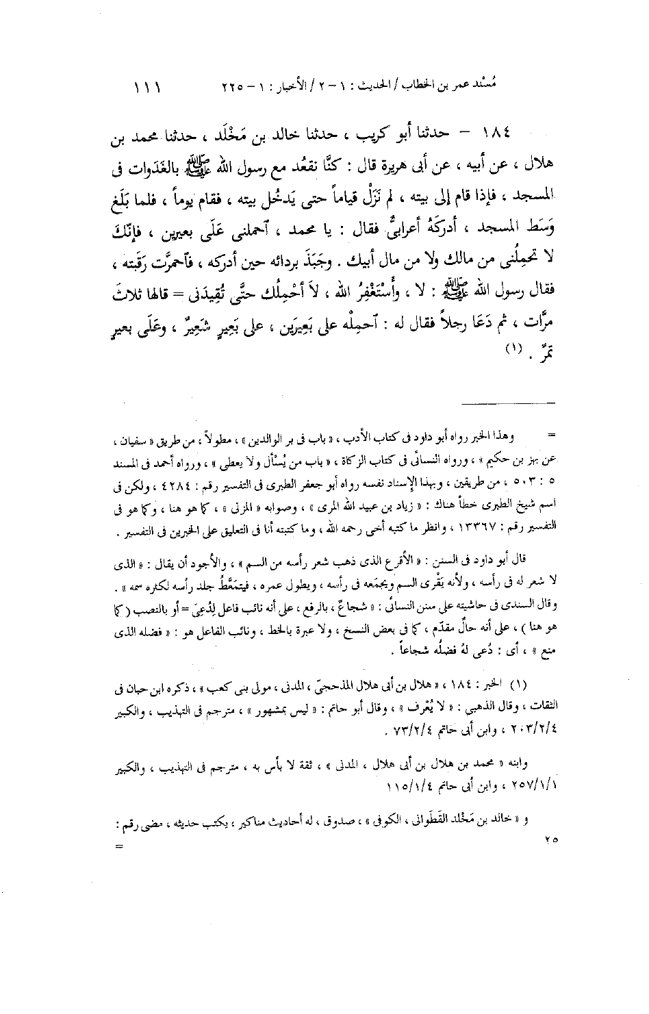 184 - حَدَّثَنَا أَبُو كُرَيْبٍ، حَدَّثَنَا خَالِدُ بْنُ مَخْلَدٍ، حَدَّثَنَا مُحَمَّدُ بْنُ هِلَالٍ، عَنْ أَبِيهِ، عَنْ أَبِي هُرَيْرَةَ، قَالَ: كُنَّا نَقْعُدُ مَعَ رَسُولِ اللَّهِ صَلَّى اللهُ عَلَيْهِ وَسَلَّمَ بِالْغَدَوَاتِ فِي الْمَسْجِدِ، فَإِذَا قَامَ إِلَى بَيْتِهِ لَمْ نَزَلْ قِيَامًا حَتَّى يَدْخُلَ بَيْتَهُ، فَقَامَ يَوْمًا، فَلَمَّا بَلَغَ وَسَطَ الْمَسْجِدِ، أَدْرَكَهُ أَعْرَابِيُّ فَقَالَ: يَا مُحَمَّدُ، احْمِلْنِي عَلَى بَعِيرَيْنِ، فَإِنَّكَ لَا تَحْمِلُنِي مِنْ مَالِكَ وَلَا مِنْ مَالِ أَبِيكَ وَجَبَذَ بِرِدَائِهِ حِينَ أَدْرَكَهُ، فَاحْمَرَّتْ رَقَبَتُهُ، فَقَالَ رَسُولُ اللَّهِ صَلَّى اللهُ عَلَيْهِ وَسَلَّمَ: «§لَا، وَأَسْتَغْفِرُ اللَّهَ، لَا أَحْمِلُكَ حَتَّى تُقِيدَنِي» قَالَهَا ثَلَاثَ مَرَّاتٍ، ثُمَّ دَعَا رَجُلًا فَقَالَ لَهُ: " احْمِلْهُ عَلَى بَعِيرَيْنِ: عَلَى بَعِيرٍ شَعِيرٌ، وَعَلَى بَعِيرِ تَمْرٌ "