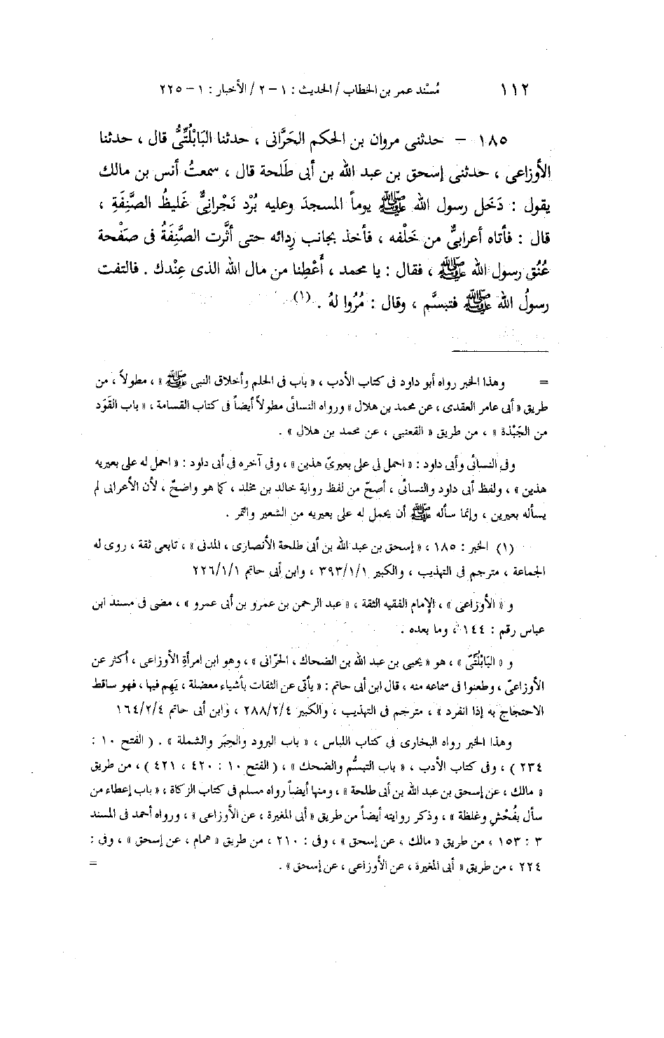 185 - حَدَّثَنِي مَرْوَانُ بْنُ الْحَكَمِ الْحَرَّانِيُّ، حَدَّثَنَا الْبَابْلُتِّيُّ، قَالَ: حَدَّثَنَا الْأَوْزَاعِيُّ، حَدَّثَنِي إِسْحَاقُ بْنُ عَبْدِ اللَّهِ بْنِ أَبِي طَلْحَةَ، قَالَ: سَمِعْتُ أَنَسَ بْنَ مَالِكٍ، يَقُولُ: " §دَخَلَ رَسُولُ اللَّهِ صَلَّى اللهُ عَلَيْهِ وَسَلَّمَ يَوْمًا الْمَسْجِدَ، وَعَلَيْهِ بُرْدٌ نَجْرَانِيٌّ غَلِيظُ الصَّنِفَةِ، قَالَ: فَأَتَاهُ أَعْرَابِيٌّ مِنْ خَلْفِهِ، فَأَخَذَ بِجَانِبِ رِدَائِهِ حَتَّى أَثَّرَتِ الصَّنِفَةُ فِي صَفْحَةِ عُنُقِ رَسُولِ اللَّهِ صَلَّى اللهُ عَلَيْهِ وَسَلَّمَ، فَقَالَ: يَا مُحَمَّدُ، أَعْطِنَا مِنْ مَالِ اللَّهِ الَّذِي عِنْدَكَ، فَالْتَفَتَ رَسُولُ اللَّهِ صَلَّى اللهُ عَلَيْهِ وَسَلَّمَ فَتَبَسَّمَ، وَقَالَ: «مُرُوا لَهُ»