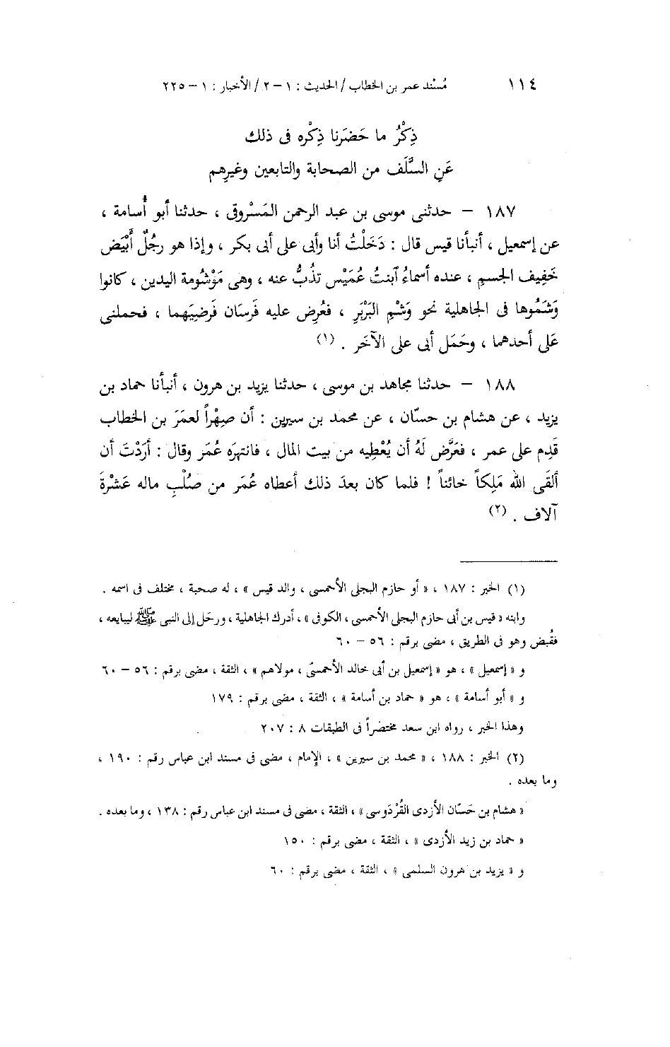 188 - حَدَّثَنَا مُجَاهِدُ بْنُ مُوسَى، حَدَّثَنَا يَزِيدُ بْنُ هَارُونَ، أَنْبَأَنَا حَمَّادُ بْنُ زَيْدٍ، عَنْ هِشَامِ بْنِ حَسَّانَ، عَنْ مُحَمَّدِ بْنِ سِيرِينَ: أَنَّ صِهْرًا لِعُمَرَ بْنِ الْخَطَّابِ قَدِمَ عَلَى عُمَرَ، فَعَرَّضَ لَهُ أَنْ يُعْطِيهَ مِنْ بَيْتِ الْمَالِ، فَانْتَهَرَهُ عُمَرُ وَقَالَ: «§أَرَدْتَ أَنْ أَلْقَى اللَّهَ مَلِكًا خَائِنًا؟» فَلَمَّا كَانَ بَعْدَ ذَلِكَ أَعْطَاهُ عُمَرُ مِنْ صُلْبِ مَالِهِ عَشَرَةَ آلَافٍ