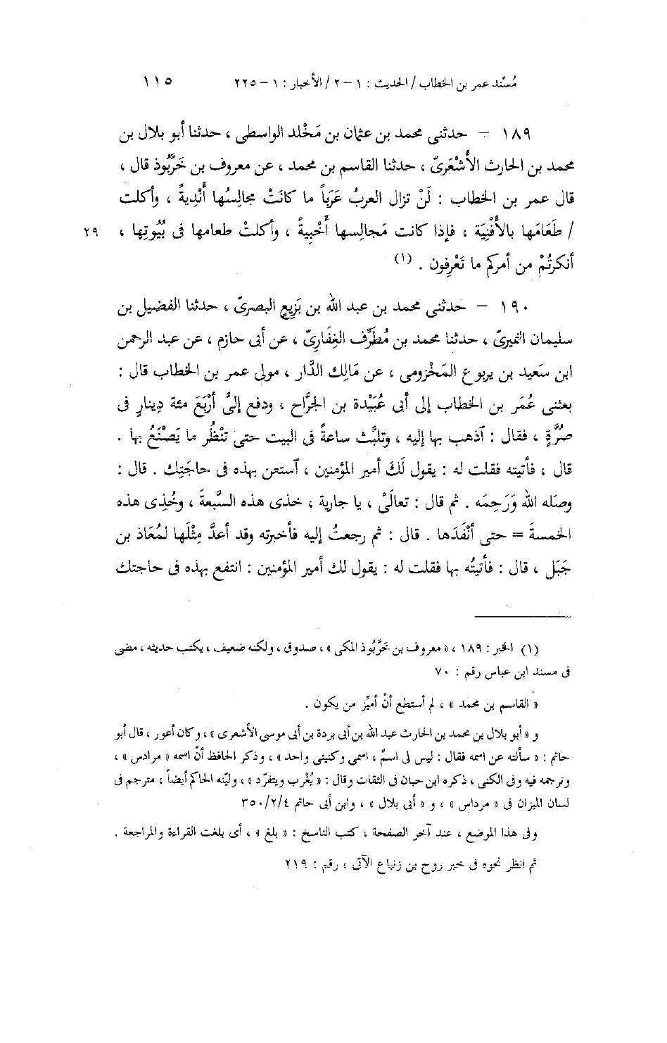 189 - حَدَّثَنِي مُحَمَّدُ بْنُ عُثْمَانَ بْنِ مَخْلَدٍ الْوَاسِطِيُّ، حَدَّثَنَا أَبُو بِلَالِ بْنُ مُحَمَّدِ بْنِ الْحَارِثِ الْأَشْعَرِيُّ، حَدَّثَنَا الْقَاسِمُ بْنُ مُحَمَّدٍ، عَنْ مَعْرُوفِ بْنِ خَرَّبُوذٍ، قَالَ: قَالَ عُمَرُ بْنُ الْخَطَّابِ: «§لَنْ تَزَالَ الْعَرَبُ عَرَبًا مَا كَانَتْ مَجَالِسُهَا أَنْدِيَةً، وَأَكَلَتْ طَعَامَهَا بِالْأَفْنِيَةِ. فَإِذَا كَانَتْ مَجَالِسُهَا أَخْبِيَةً، وَأَكَلَتْ طَعَامَهَا فِي بُيُوتِهَا، أَنْكَرْتُمْ مِنْ أَمْرِكُمْ مَا تَعْرِفُونَ»