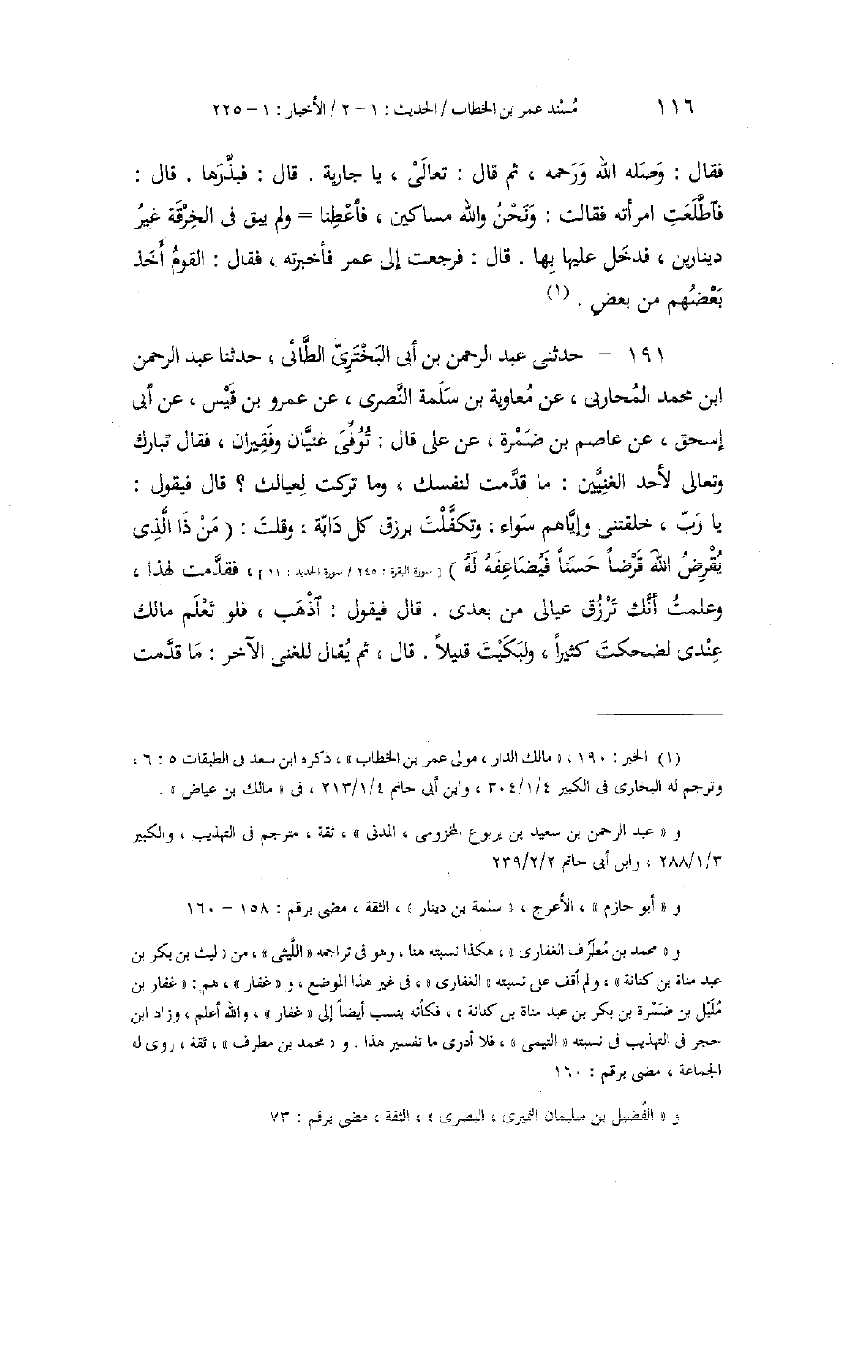 191 - حَدَّثَنِي عَبْدُ الرَّحْمَنِ بْنُ أَبِي الْبَخْتَرِيِّ الطَّائِيُّ، حَدَّثَنَا عَبْدُ الرَّحْمَنِ بْنُ مُحَمَّدٍ الْمُحَارِبِيُّ، عَنْ مُعَاوِيَةَ بْنِ سَلَمَةَ النَّصْرِيِّ، عَنْ عَمْرِو بْنِ قَيْسٍ، عَنْ أَبِي إِسْحَاقَ، عَنْ عَاصِمِ بْنِ ضَمْرَةَ، عَنْ عَلِيٍّ، قَالَ: " §تُوُفِّيَ غَنِيَّانِ وَفَقِيرَانِ، فَقَالَ تَبَارَكَ وَتَعَالَى لِأَحَدِ الْغَنِيَّيْنِ: مَا قَدَّمْتَ لِنَفْسِكَ، وَمَا تَرَكْتَ لِعِيَالِكَ؟ قَالَ: فَيَقُولُ: يَا رَبِّ، خَلَقْتَنِي وَإِيَّاهُمْ سَوَاءً، وَتَكَفَّلْتَ بِرِزْقِ كُلِّ دَابَّةٍ، وَقُلْتَ: {مَنْ ذَا الَّذِي يُقْرِضُ اللَّهَ قَرْضًا حَسَنًا فَيُضَاعِفَهُ لَهُ} [البقرة: 245] ، فَقَدَّمْتُ لِهَذَا، وَعَلِمْتُ أَنَّكَ تَرْزُقُ عِيَالِي مِنْ بَعْدِي، قَالَ: فَيَقُولُ: اذْهَبْ، فَلَوْ تَعْلَمُ مَا لَكَ عِنْدِي لَضَحِكْتَ كَثِيرًا، وَلَبَكْيَتَ قَلِيلًا. قَالَ: ثُمَّ يُقَالُ لِلْغَنِيِّ الْآخَرِ: مَا قَدَّمْتَ -[117]- لِنَفْسِكَ، وَمَا تَرَكْتَ لِعِيَالِكَ؟ فَيَقُولُ: يَا رَبِّ، كَانَ لِي عِيَالٌ تَخَوَّفْتُ عَلَيْهِمُ الْعَيْلَةَ، قَالَ: فَيَقُولُ تَبَارَكَ وَتَعَالَى: أَلَمْ أَخْلُقْكَ وَإِيَّاهُمْ سَوَاءً، وَتَكَفَّلْتُ بِرِزْقِ كُلِّ دَابَّةٍ؟ فَقَالَ: بَلَى، وَلَكِنْ تَخَوَّفْتُ عَلَيْهِمُ الْعَيْلَةَ، قَالَ: فَقَدْ أَصَابَهُمْ مَا حَذِرْتَ عَلَيْهِمْ، فَاذْهَبْ، فَلَوْ تَعْلَمُ مَا لَكَ عِنْدِي لَضَحِكْتَ قَلِيلًا وَلَبَكَيْتَ كَثِيرًا. وَقَالَ لِأَحَدِ الْفَقِيرَيْنِ: مَا قَدَّمْتَ لِنَفْسِكَ، وَمَا تَرَكْتَ لِعِيَالِكَ؟ قَالَ: فَيَقُولُ: يَا رَبِّ خَلَقْتَنِي صَحِيحًا فَصِيحًا، وَعَلَّمْتَنِي أَسْمَاءَكَ وَدُعَاءَكَ، وَلَوْ كُنْتَ أَكْثَرْتَ لِي لَخَشِيتُ أَنْ يَشْغَلَنِي عَنْ طَاعَتِكَ، فَقَدْ رَضِيتُ عَنْكَ يَا رَبِّ، قَالَ: فَيَقُولُ: وَأَنَا رَاضٍ عَنْكَ، فَاذْهَبْ، فَلَوْ تَعْلَمُ مَا لَكَ عِنْدِي لَضَحِكْتَ كَثِيرًا وَلَبَكَيْتَ قَلِيلًا، وَقَالَ لِلْفَقِيرِ الْآخَرِ: مَا قَدَّمْتَ لِنَفْسِكَ، وَمَا تَرَكْتَ لِعِيَالِكَ؟ قَالَ: فَيَقُولُ: يَا رَبِّ، أَعْطَيْتَنِي شَيْئًا تَسْأَلُنِي عَنْهُ؟ قَالَ: فَيَقُولُ: أَلَمْ أَخْلُقْكَ صَحِيحًا فَصِيحًا، وَجَعَلْتُكَ سَمِيعًا بَصِيرًا، وَقُلْتُ: {ادْعُونِي أَسْتَجِبْ لَكُمْ} [غافر: 60] ، قَالَ: بَلَى يَا رَبِّ، وَلَكِنِّي نَسِيتُ، قَالَ: وَأَنَا أَنْسَاكَ الْيَوْمَ، فَاذْهَبْ، فَلَوْ تَعْلَمُ مَا لَكَ عِنْدِي لَضَحِكْتَ قَلِيلًا، وَلَبَكَيْتَ كَثِيرًا "
